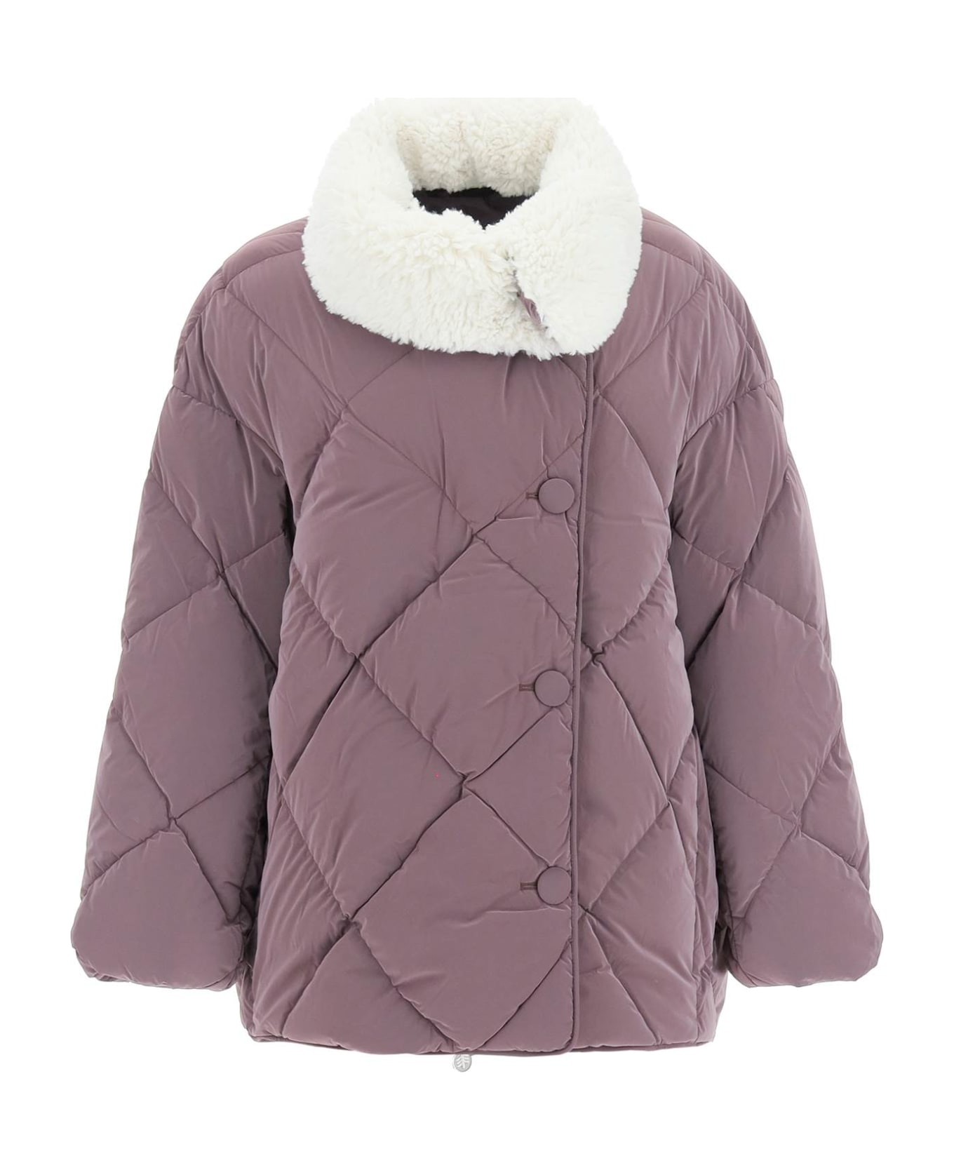 Oversized diamond-quilted puffer jacket by Ienki Ienki, made of nylon twill with goose down padding. It features a off-center double-slider