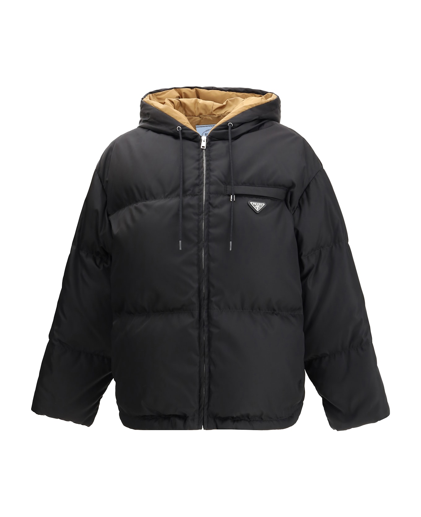 Prada's re-nylon gabardine hooded down jacket combines technicality and contemporary style. filled with goose down, it features a hood with lace-up drawstring, long sleeves and a straight cuff. the zippered front closure is flanked by exterior pockets and interior small pockets, both zippered. the adjustable elastic drawstring hem ensures comfort, while the enameled metal triangle logo signs the garment with the unmistakable brand identity. Composition: 100% % Recycled Polyamide