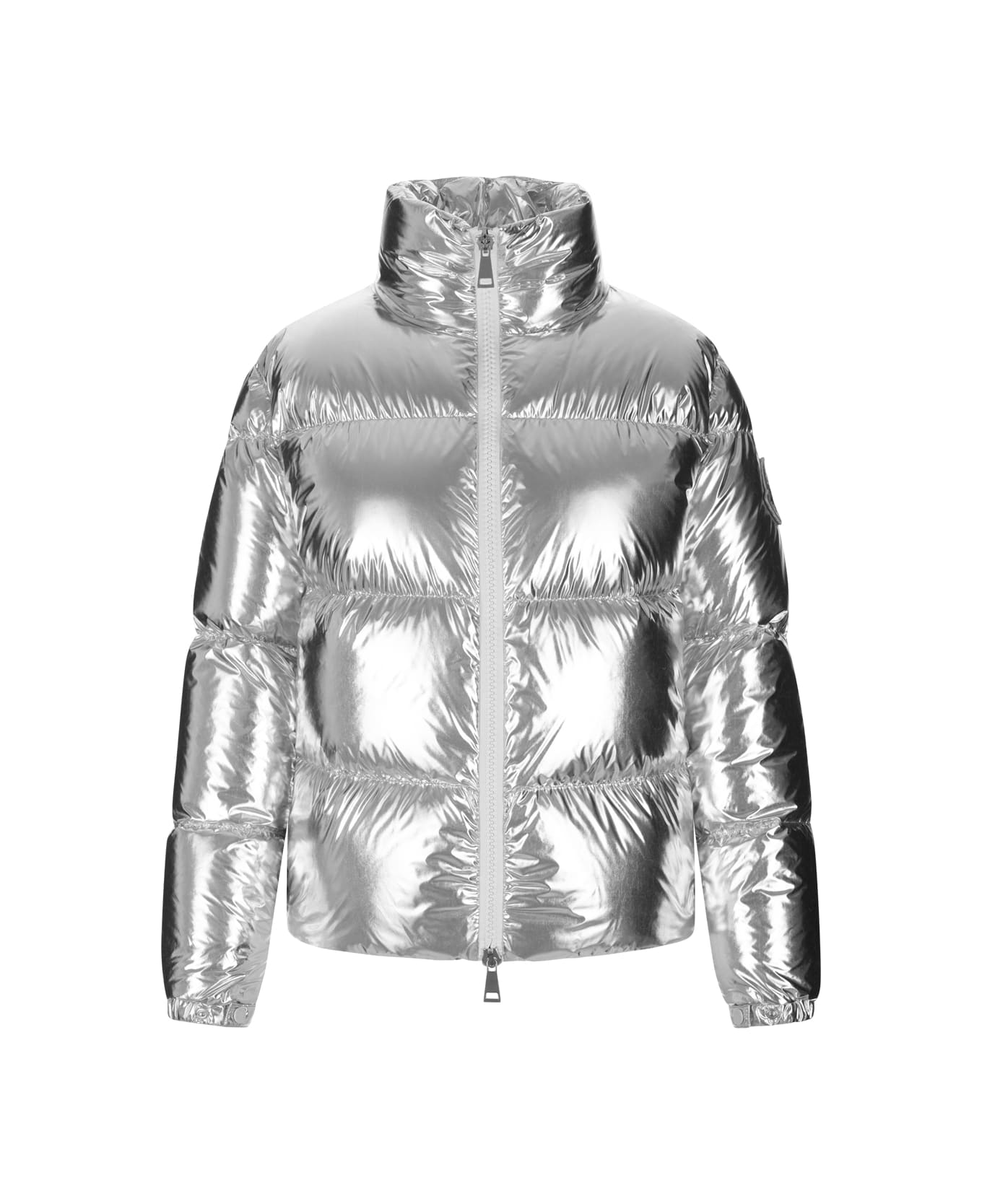 Silver-colored Meuse short down jacket by Moncler made of mirror-effect laminated nylon with down filling and a longue saison lining gives lightness to the garment. The garment features a high collar, short cut, embroidered logo, zipper pockets and 2-way zipper closure. The inner drawstring at the bottom allows you to adjust the fit.