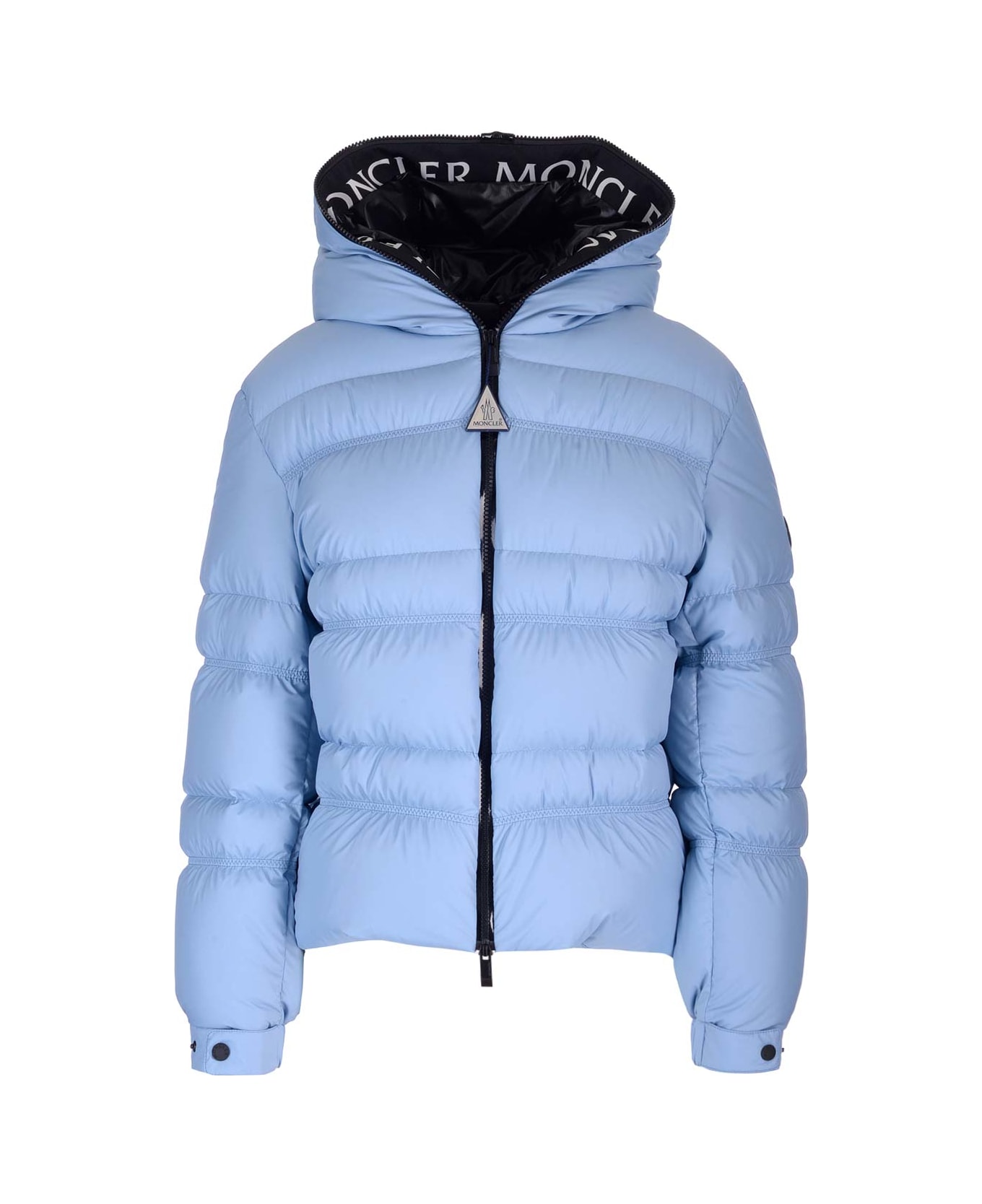 'Yser' down jacket from Moncler Matt Black collection in powder blue matte nylon. Made in recycled micro ripstop, with recycled micro ripstop lining, down padding, hood, zip fastening, zip pockets, drawstring hem and adjustable cuffs.