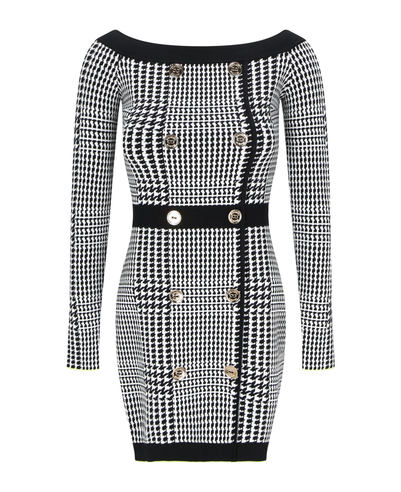 Dress by elisabetta franchi, boat neckline with stretch ribs, three-quarter sleeves, iconic embossed buttons applied on the front, contrasting edged profiles and hem, regular fit. Composition: 1% % Elastane, 16% % Nylon, 23% % Polyester, 60% % Viscose