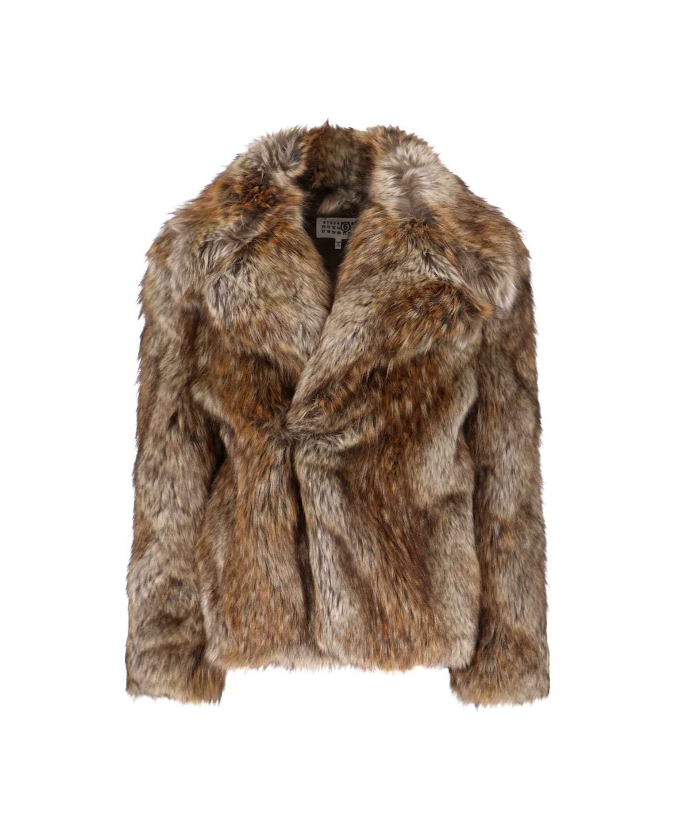 Maison Margiela Faux MM6 fur jacket in brown fabric with classic lapels, metal hook closure, two side pockets, straight hem. Composition: 80% Acrylic, 20% Polyester