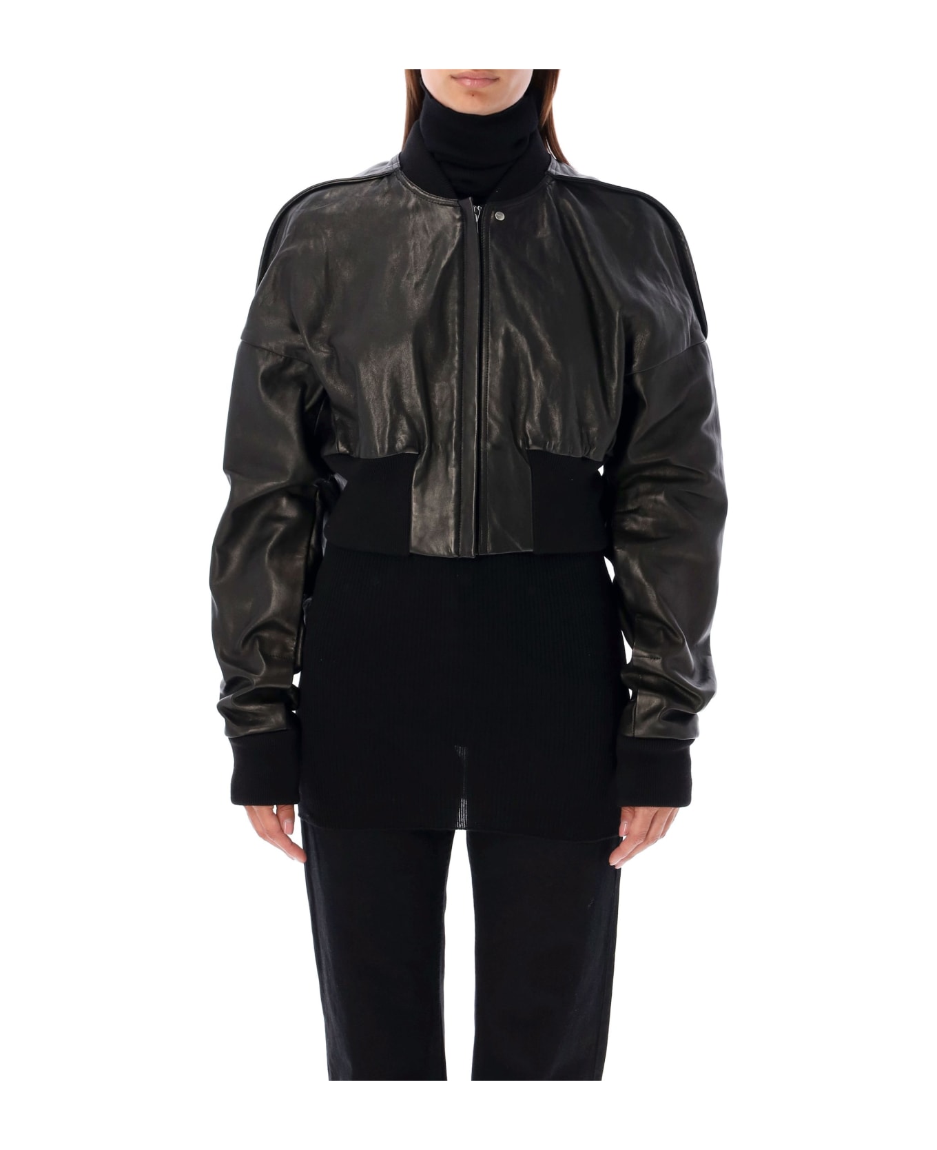 Flight Jacket Cropped By Rick Owens. Featuring: Loose Fit Silhouette Lamb Leather Fabric Ribbed Crew Neck Collar Long Sleeves With Ribbed Cuffs Front Zip Closure Ribbed Hem Model Is 1,72 And Wears Size 40.