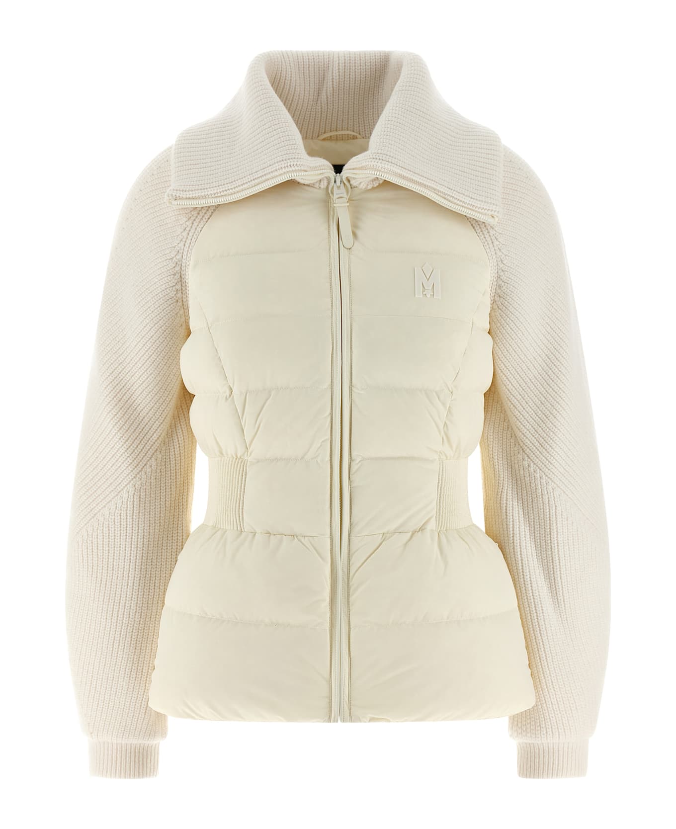 'Foxy' water-repellent nylon down jacket with down padding, long balloon sleeves in lined and padded wool, front logo patch, wool collar, zip closure, pockets, elastic waistband. Composition: 82% nylon, 18% spandex