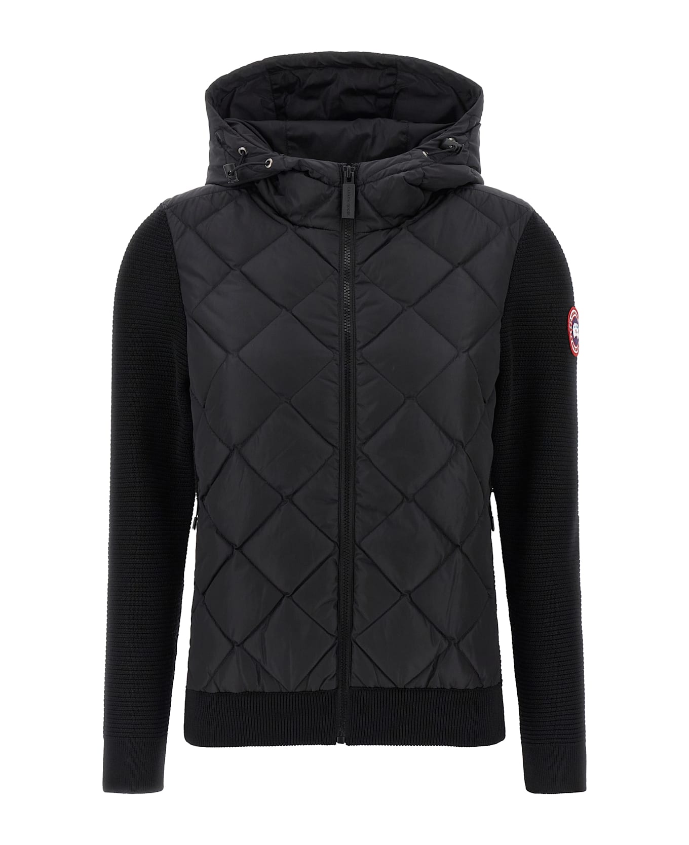 'HyBridge® Quilted Knit' middle-weight merino wool jacket with water-repellent Performance Nylon insert quilted diamond and goose down padding, adjustable hood, front zip closure, pockets, long cuffed sleeves and logo patch appliqué. Garment characterized by Thermal Mapping® technology.