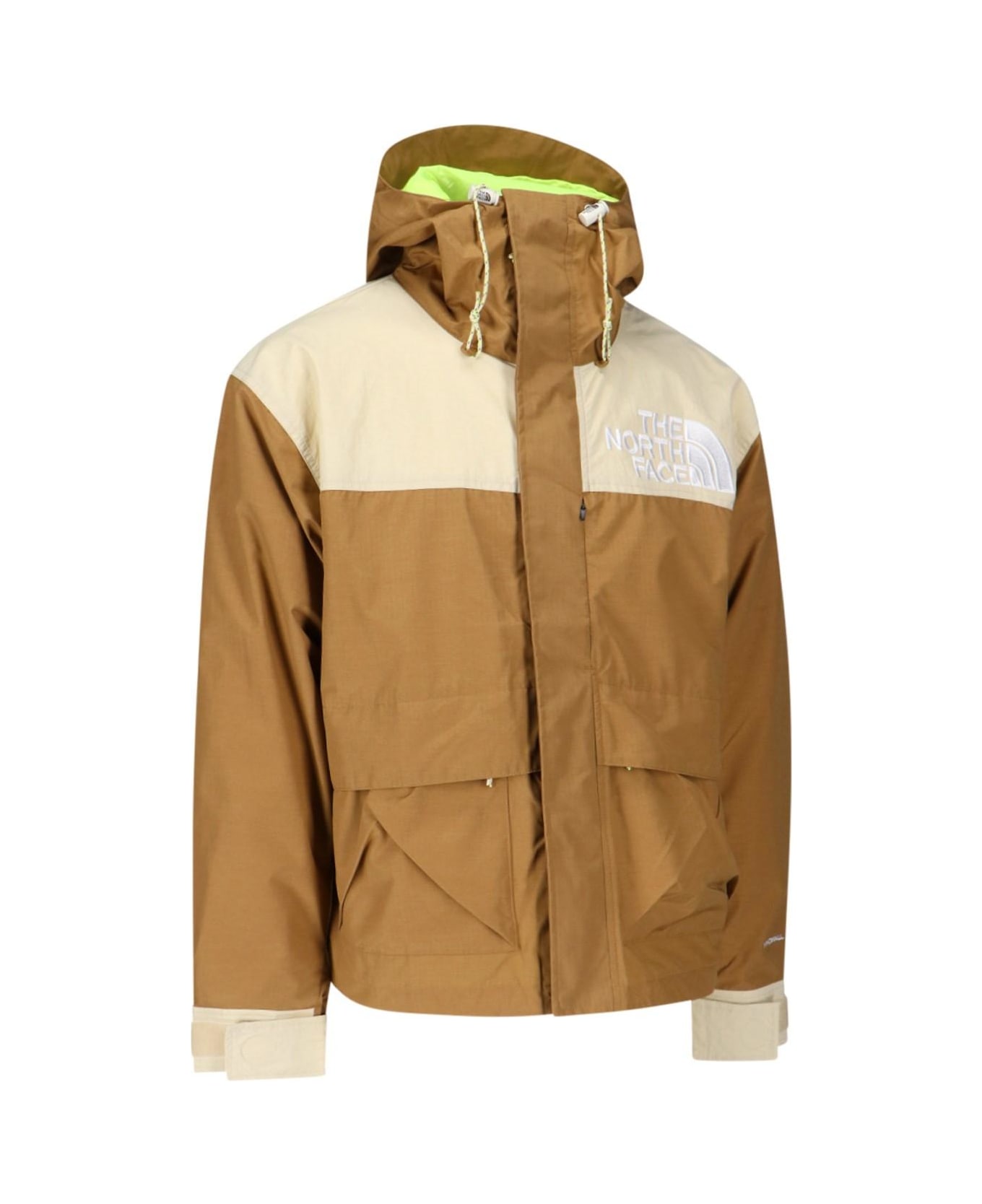 The North Face '86 Low-Fi Hi-Tek Mountain' brown jacket with beige details, neon yellow inserts, drawstring hood, zip closure, two front patch pockets, chest zip pocket, adjustable cuffs, straight hem.