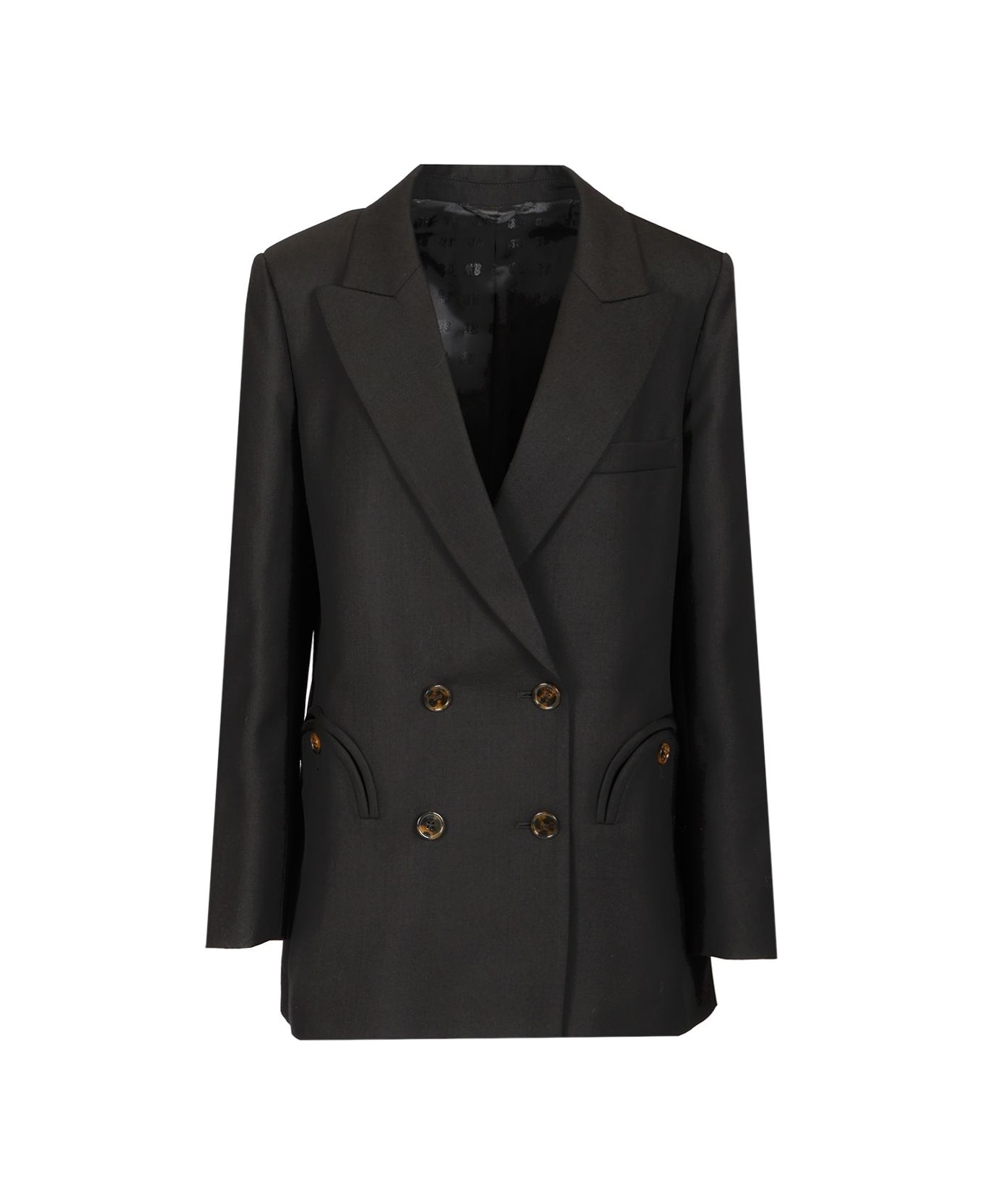"Alcanara Black" double-breasted blazer from Blazè made of virgin wool twill with boxy cut and slightly oversized fit. It features lightly padded shoulder straps, shiny loden-inspired buttons, peak lapels, low external pockets and four internal pockets, two back vents.