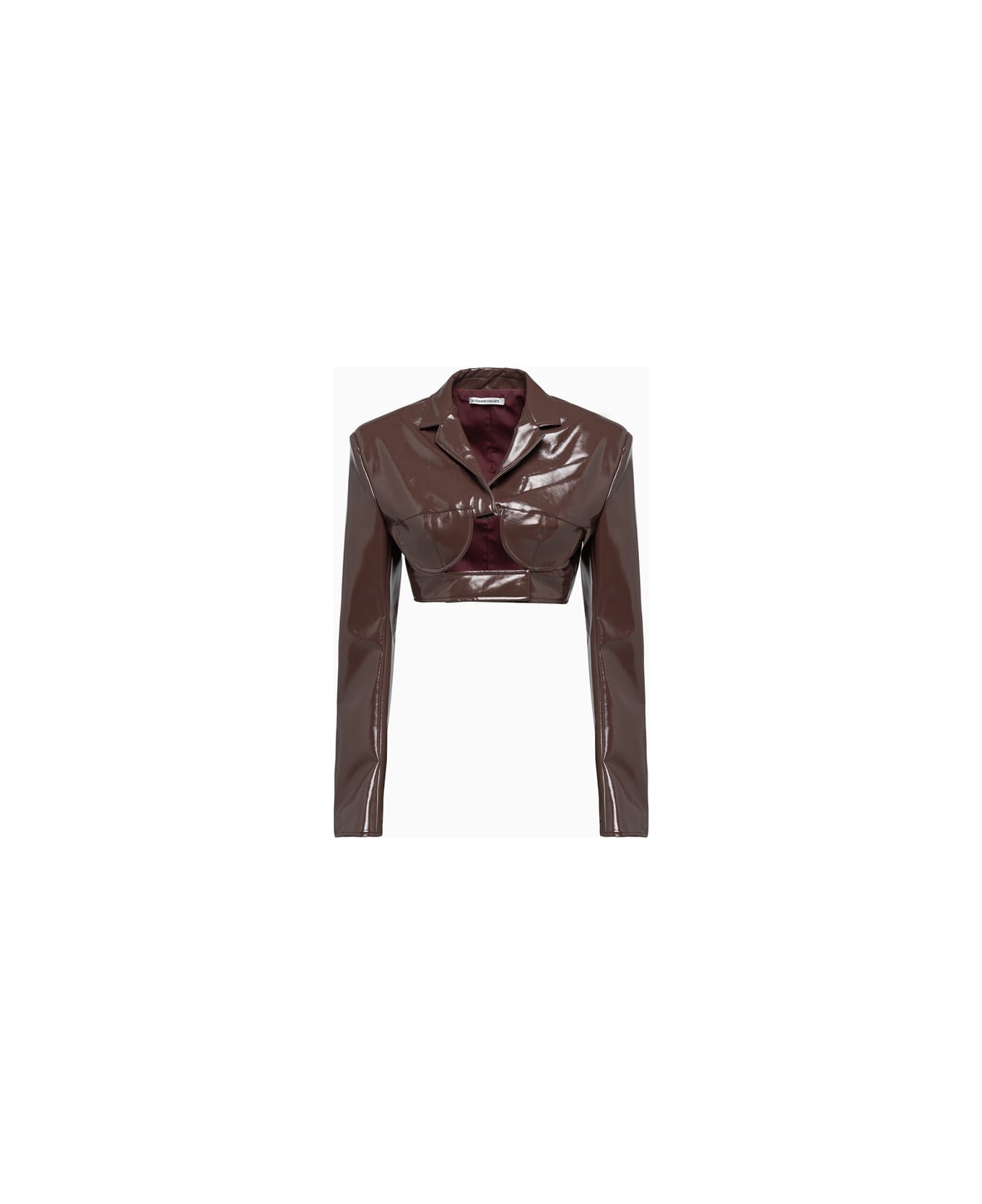 made in italy cropped blazer in solid color patent-effect eco leather. reverse collar. padded shoulders. long sleeves. concealed snap button closure and zip; interior hook. color matched lining. regular cropped fit. composition: 100% polyurethane lining 100% viscose.