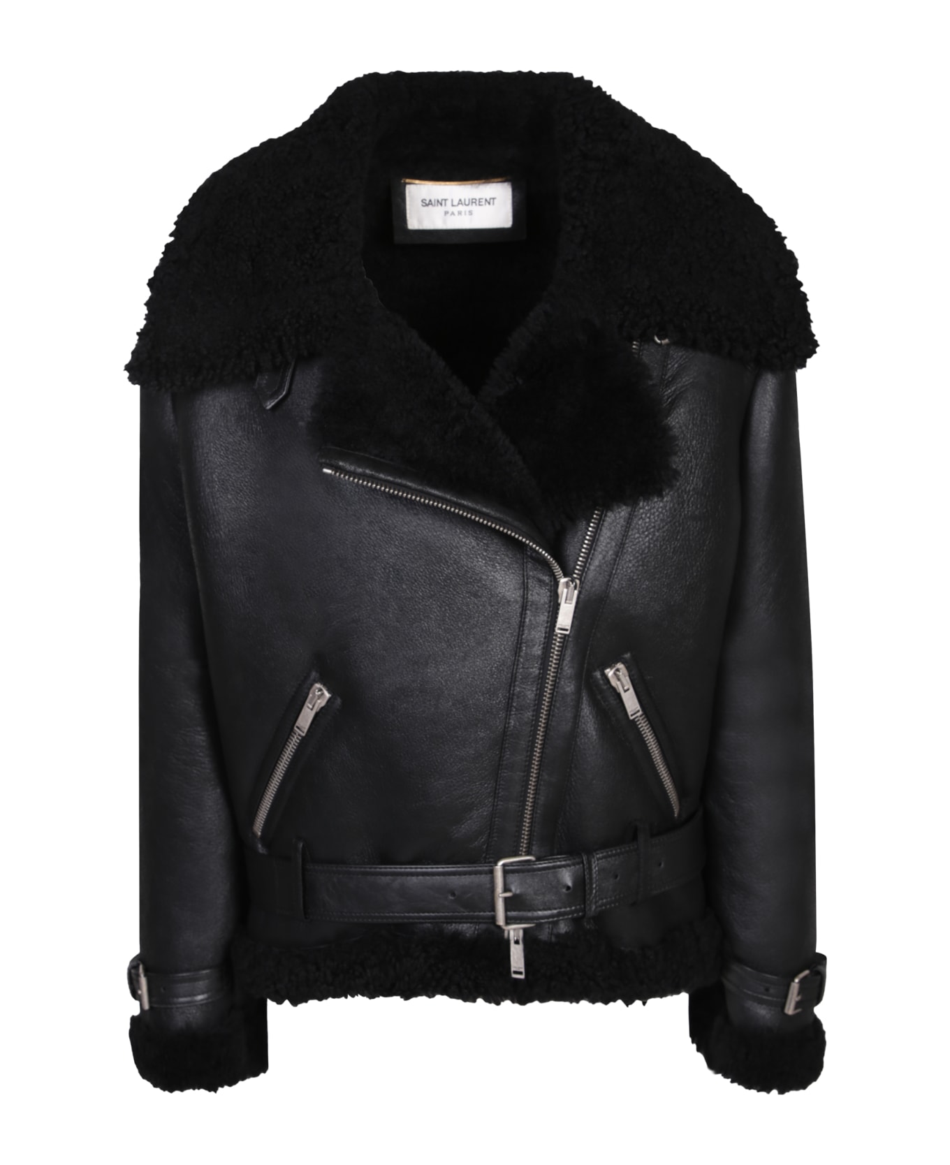 Pointed collar. Long sleeves. Shearling lining. Asymmetrical zipper closure. Two zippered side pockets. Adjustable belt at waist. Color: black