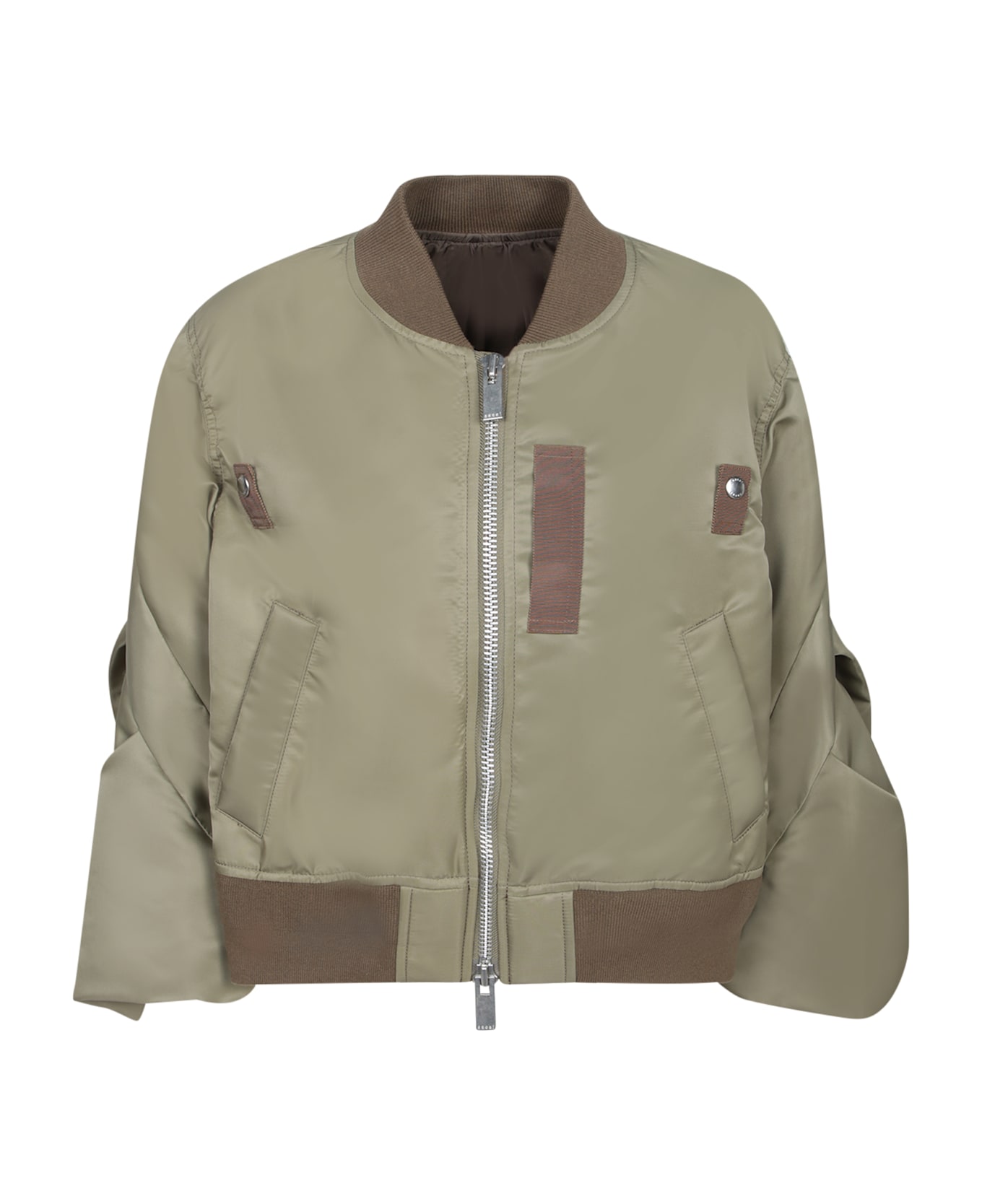 This SACAI beige twill blouson is enhanced with leather trim and functional features like zip pockets. A versatile and stylish piece for the season.