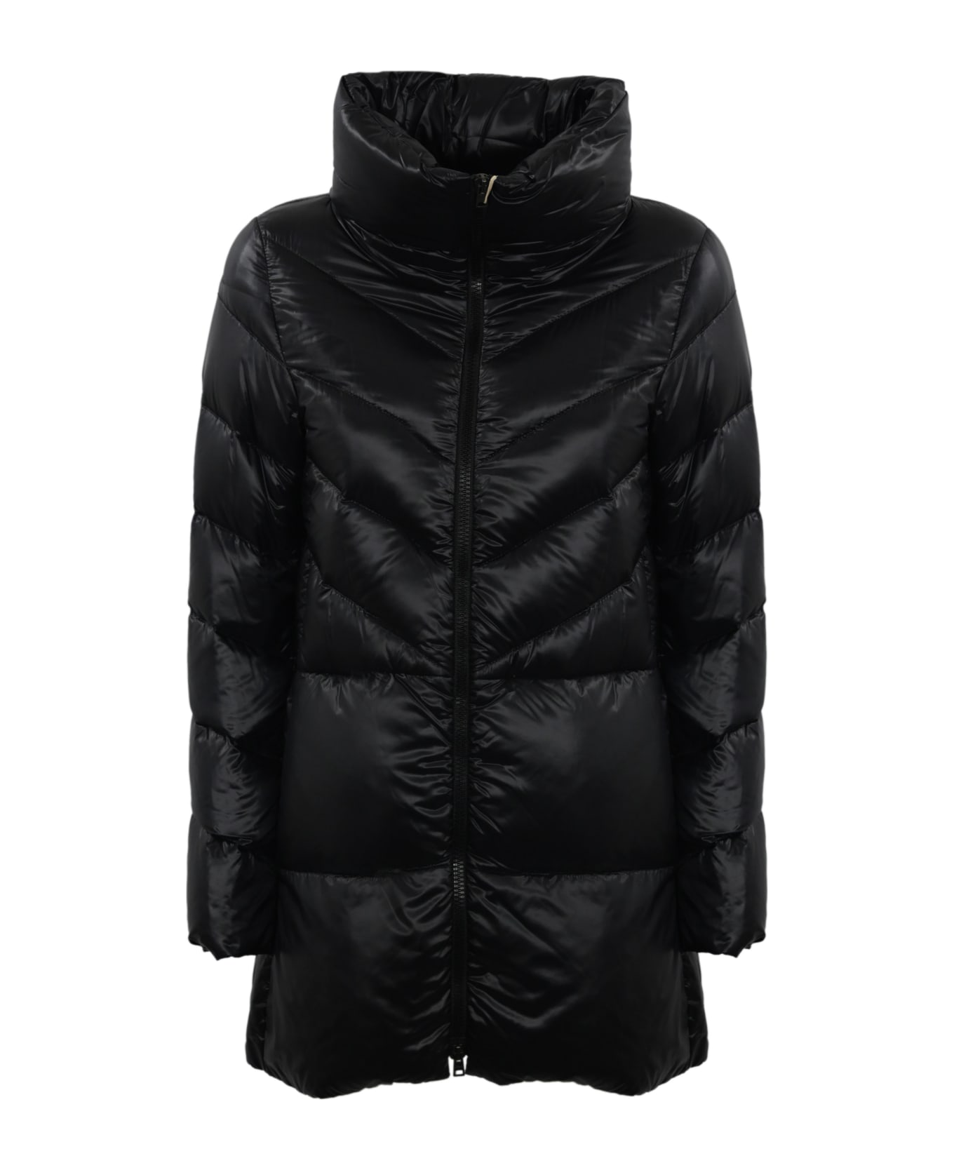 women's medium length down jacket: ultralight nylon long sleeves double slider zip closure quilted design polo neck side pockets straight hem a-line padded lined regular fit composition: 100% polyamide
