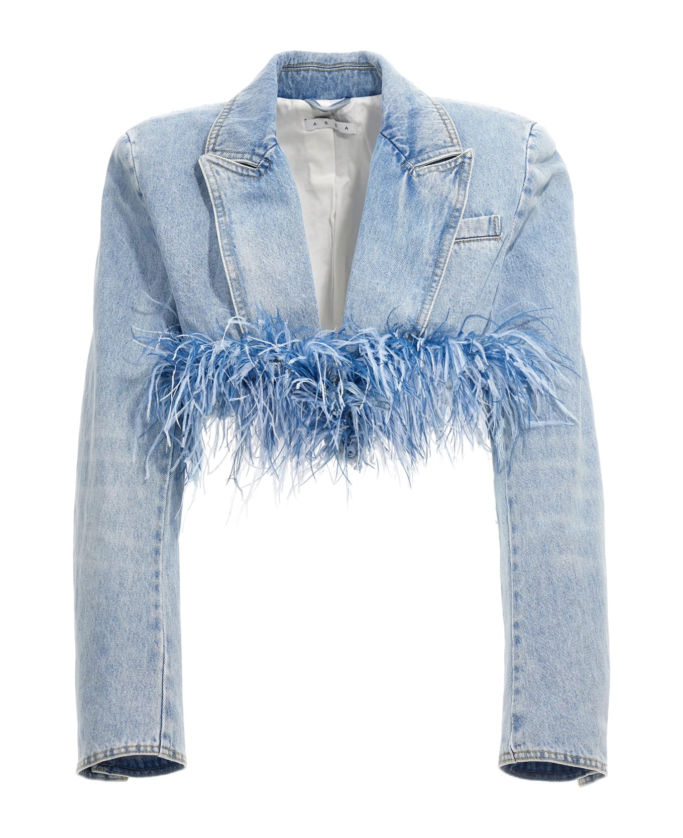 Frayed Denim Feather Cropped' cotton denim blazer jacket with cropped style, feather application on the hem, hook closure, padded shoulders and long sleeves.