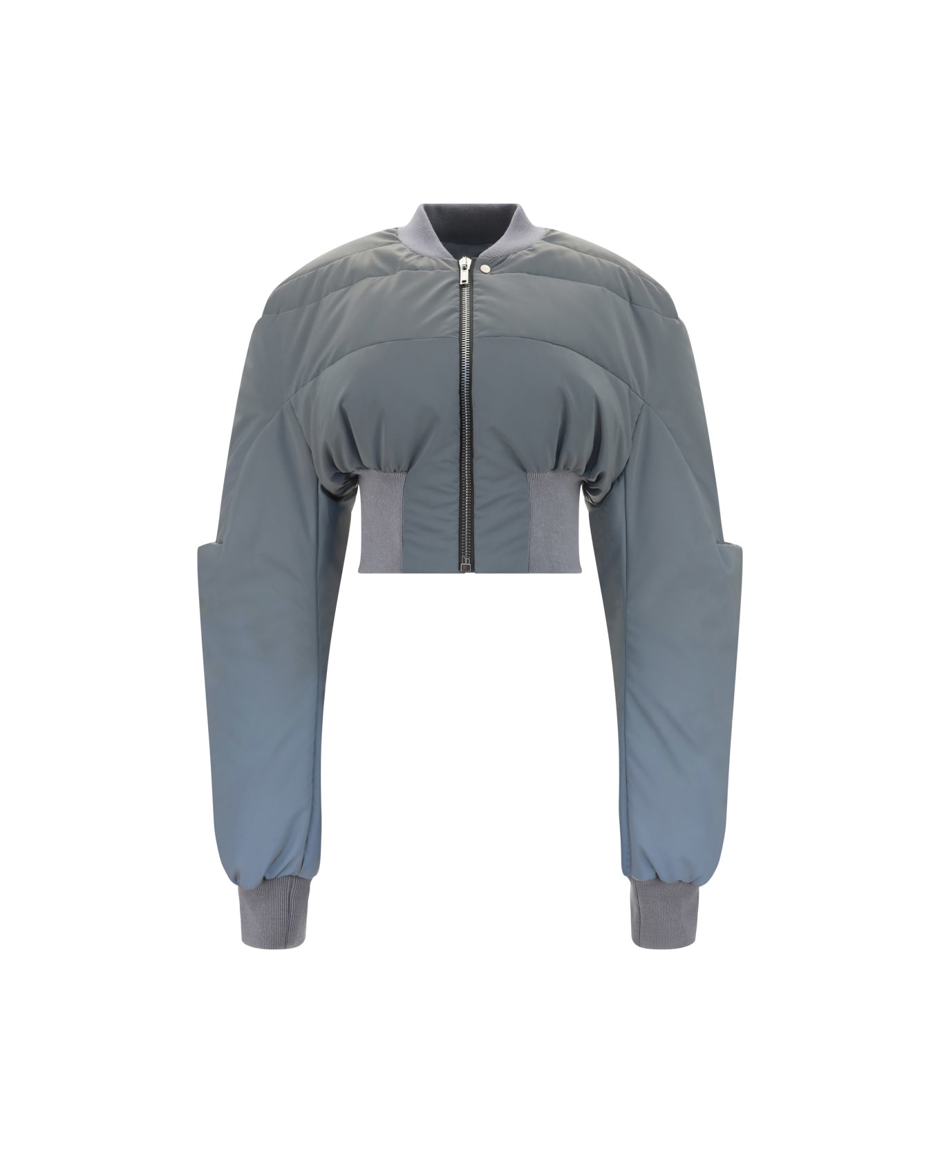 Bomber jacket by rick owens, cropped model, ribbed crew neck, padded and quilted reflective effect design, front zipper closure, iconic brand signature engraved on mini metal plaque applied on front, two welt pockets on arms, ribbed cuffs, ribbed hem.