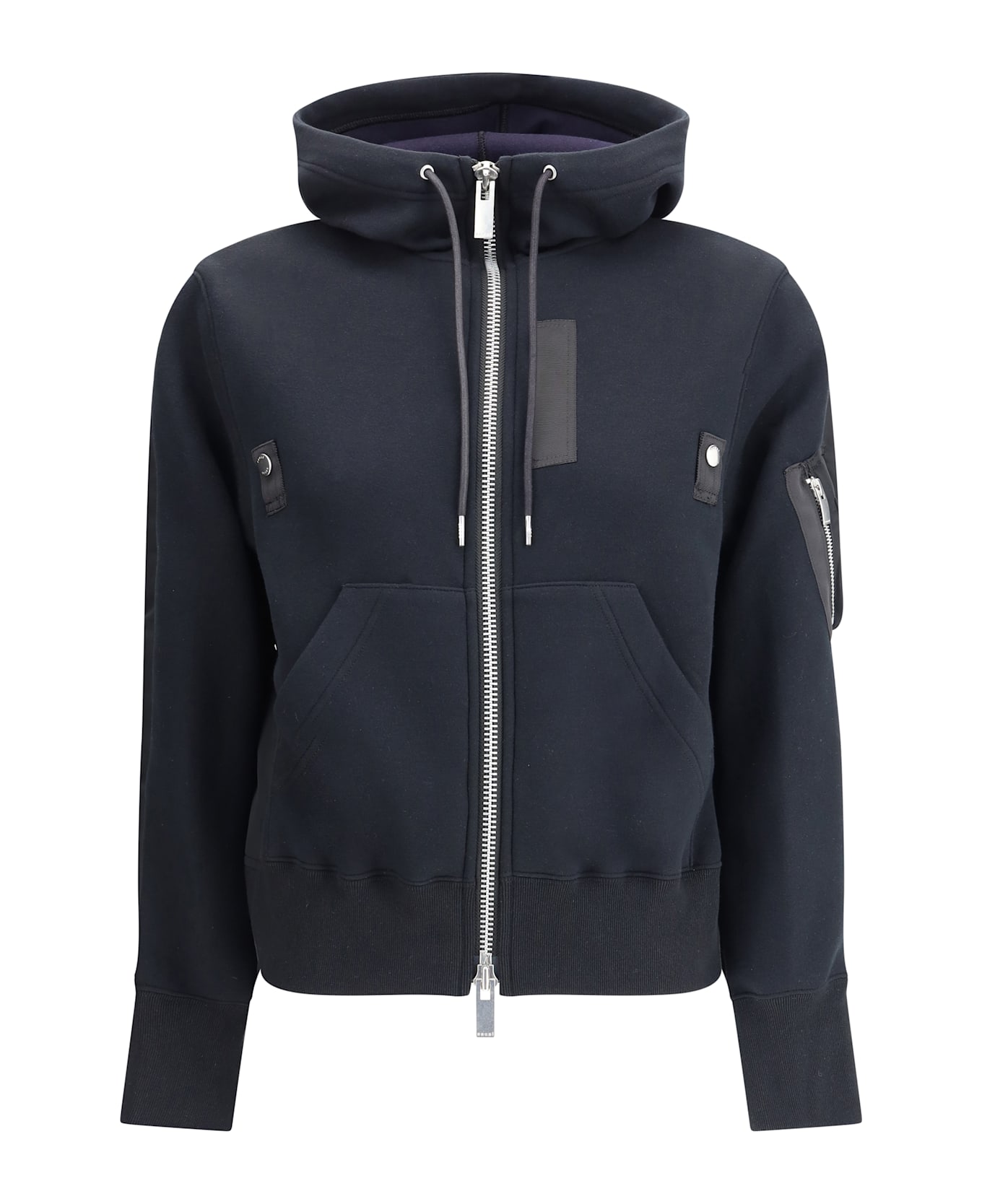 Sacai's bomber jacket is a contemporary style with a front zipper closure and two patch pockets on the front. nylon sleeves and back give a technical look, while the adjustable drawstring hood adds functionality. ribbed cuffs and hem complete the design for a comfortable fit.