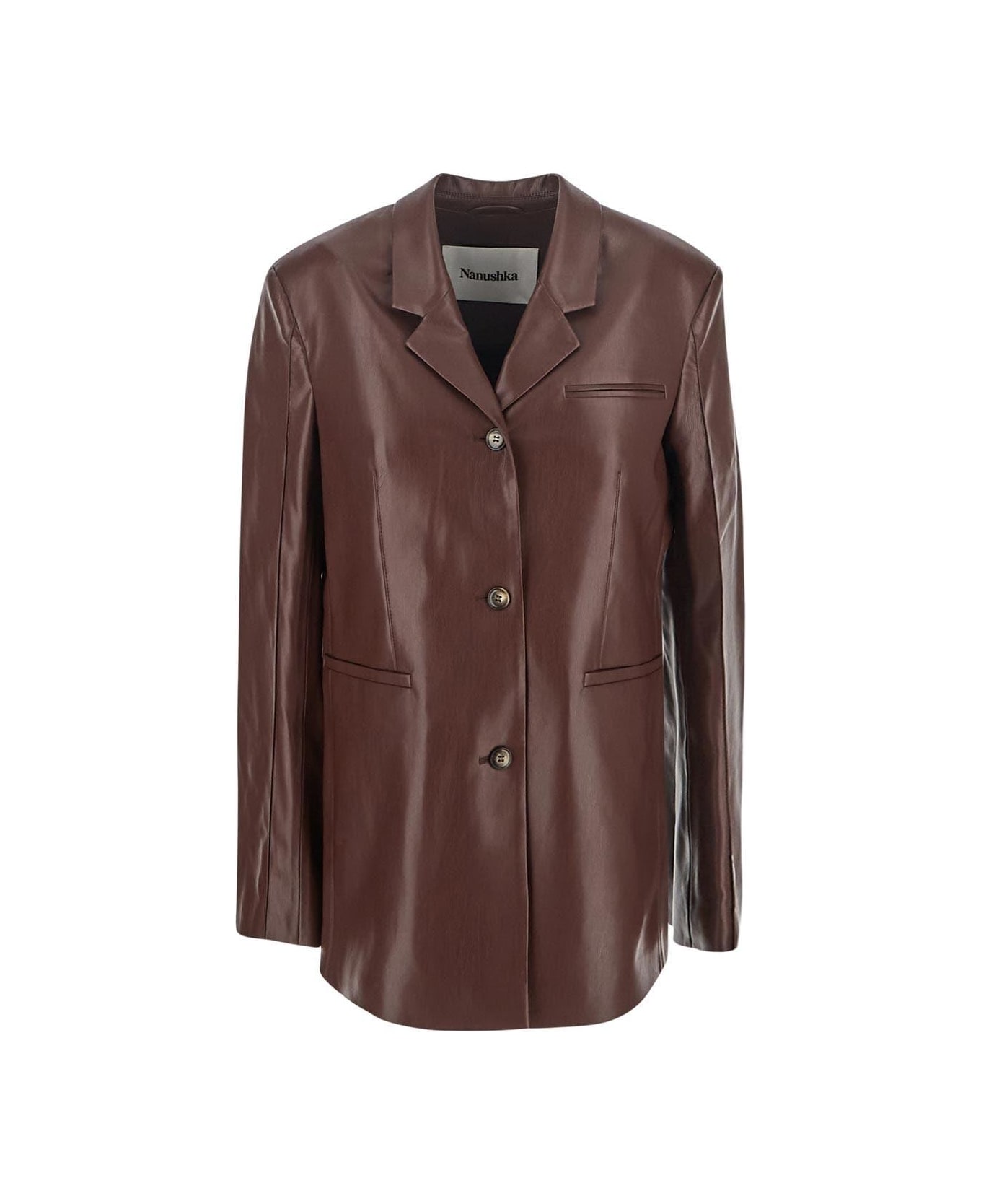 Nanushka jacket in plum faux leather with boxy fit. The item is featued by a front closure with buttons, two front pockets and a lapel collar.