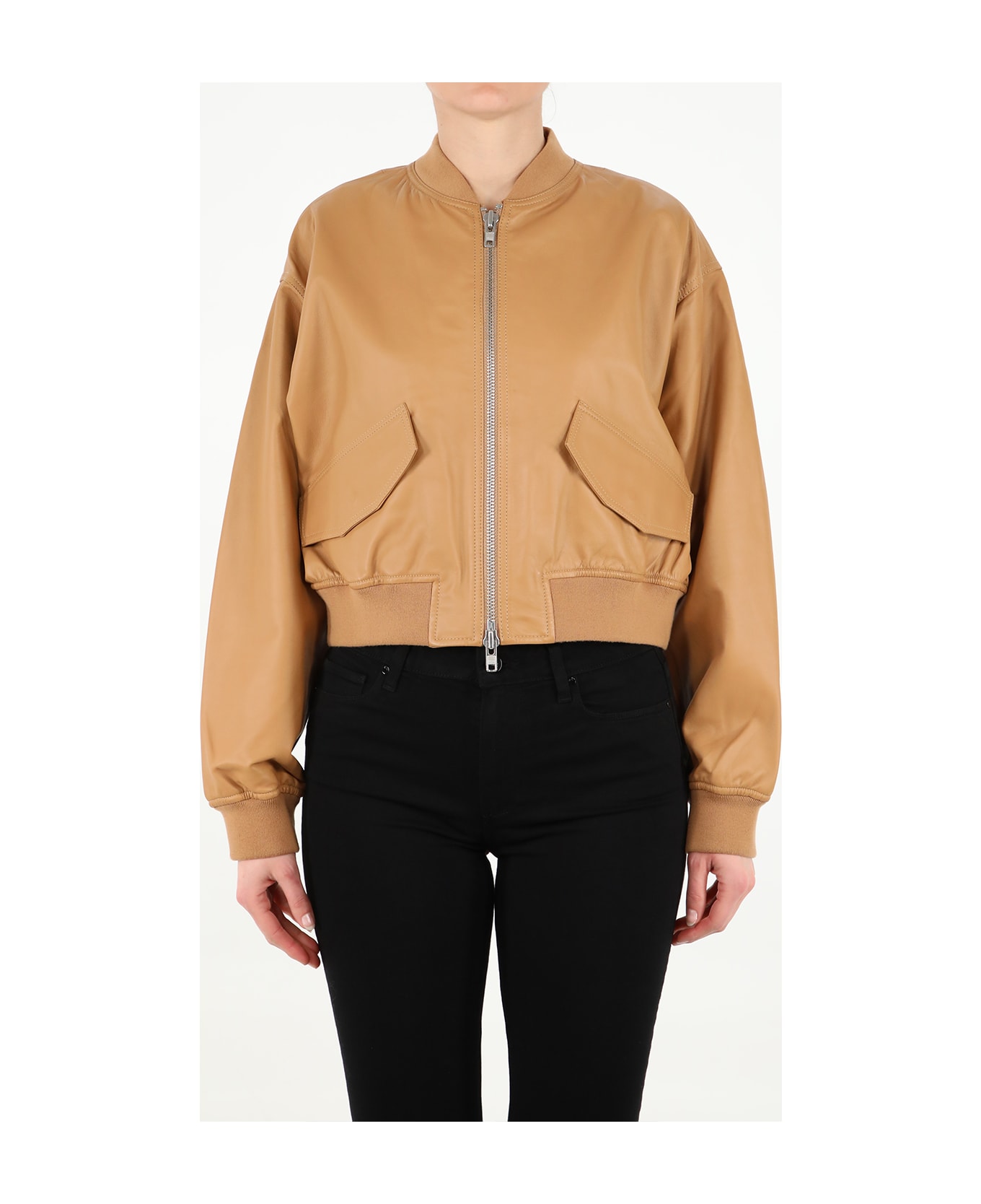 Camel leather jacket. It features front zip closure, two side flap pockets and ribbed neck, cuffs and hem.