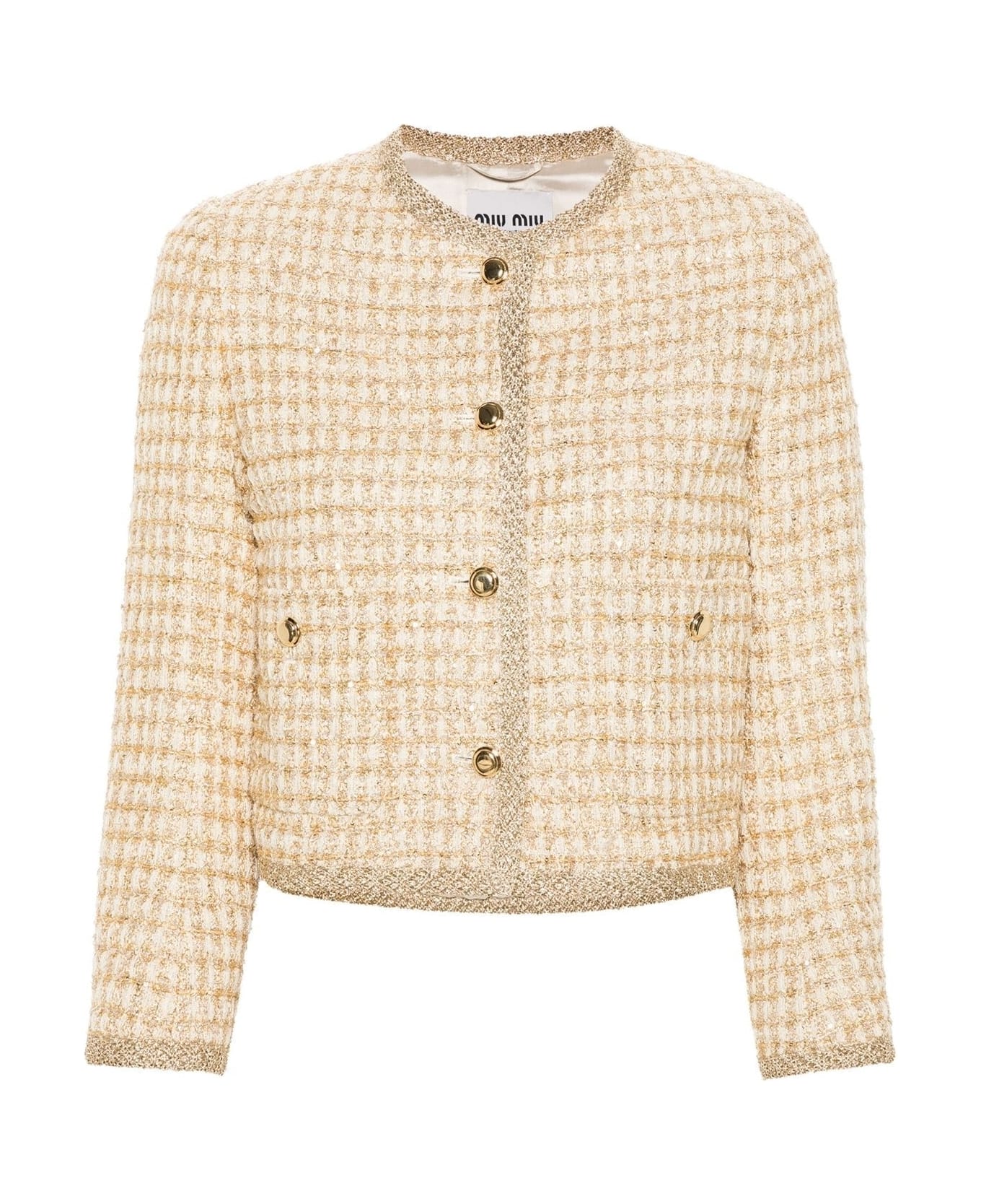 Composition: 30% Cotton 5% Metallised Fiber 22% Polyamide 32% Polyester 11% Viscose Long sleeves Front button closure Back logo detail Straight hem Specialist wash Two front patch pockets Tweed Metallic texture Manifoldless design Made in Italy