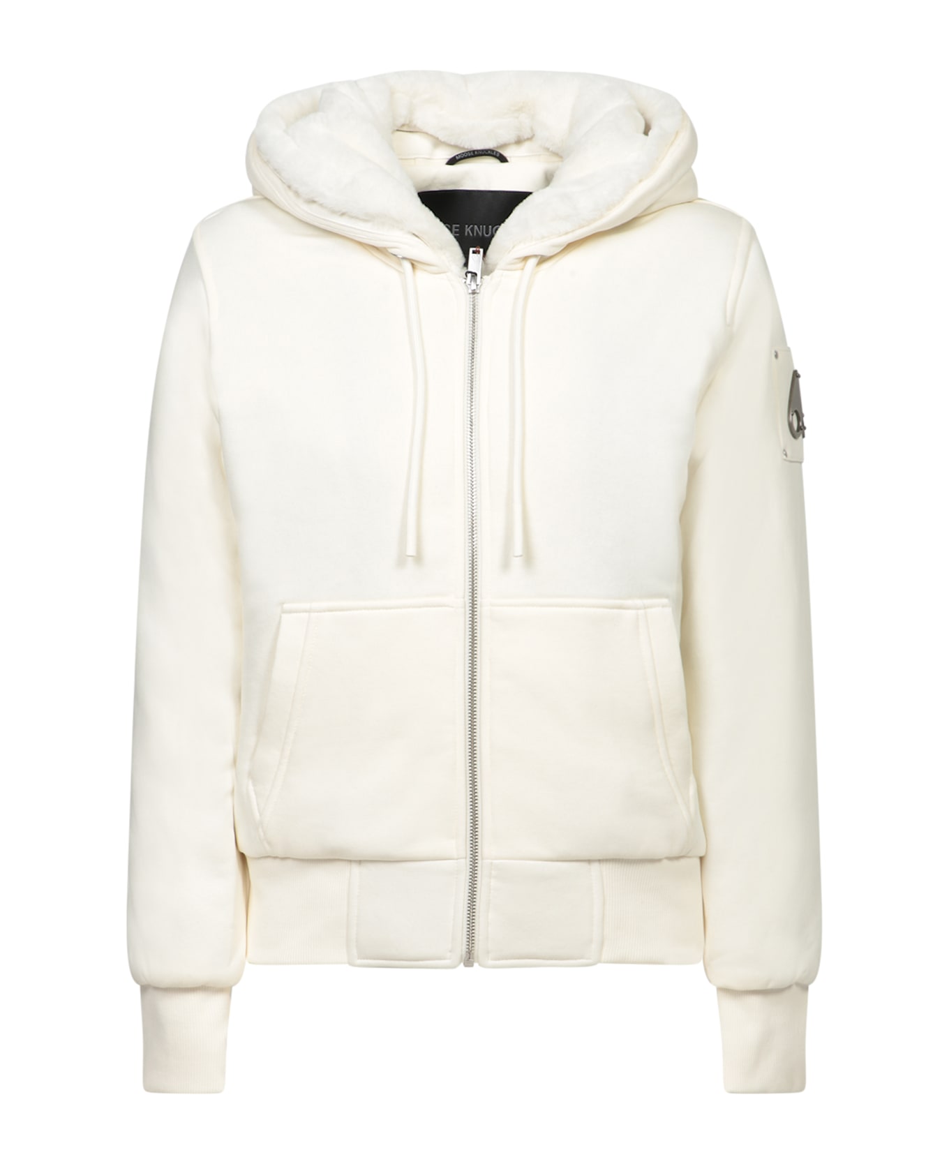Elegant Moose Knuckles jacket in soft white fabric, perfect for a refined casual look. Features a fur-lined hood, zip closure, and signature logo patch on the sleeve.