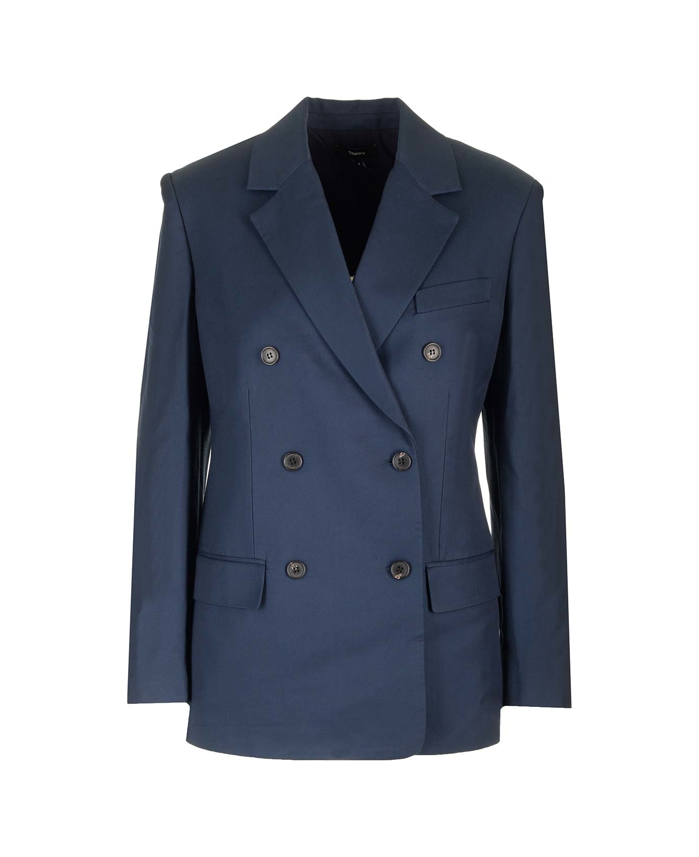 Navy blue fitted blazer from Theory with double-breasted line and double vent on the back.