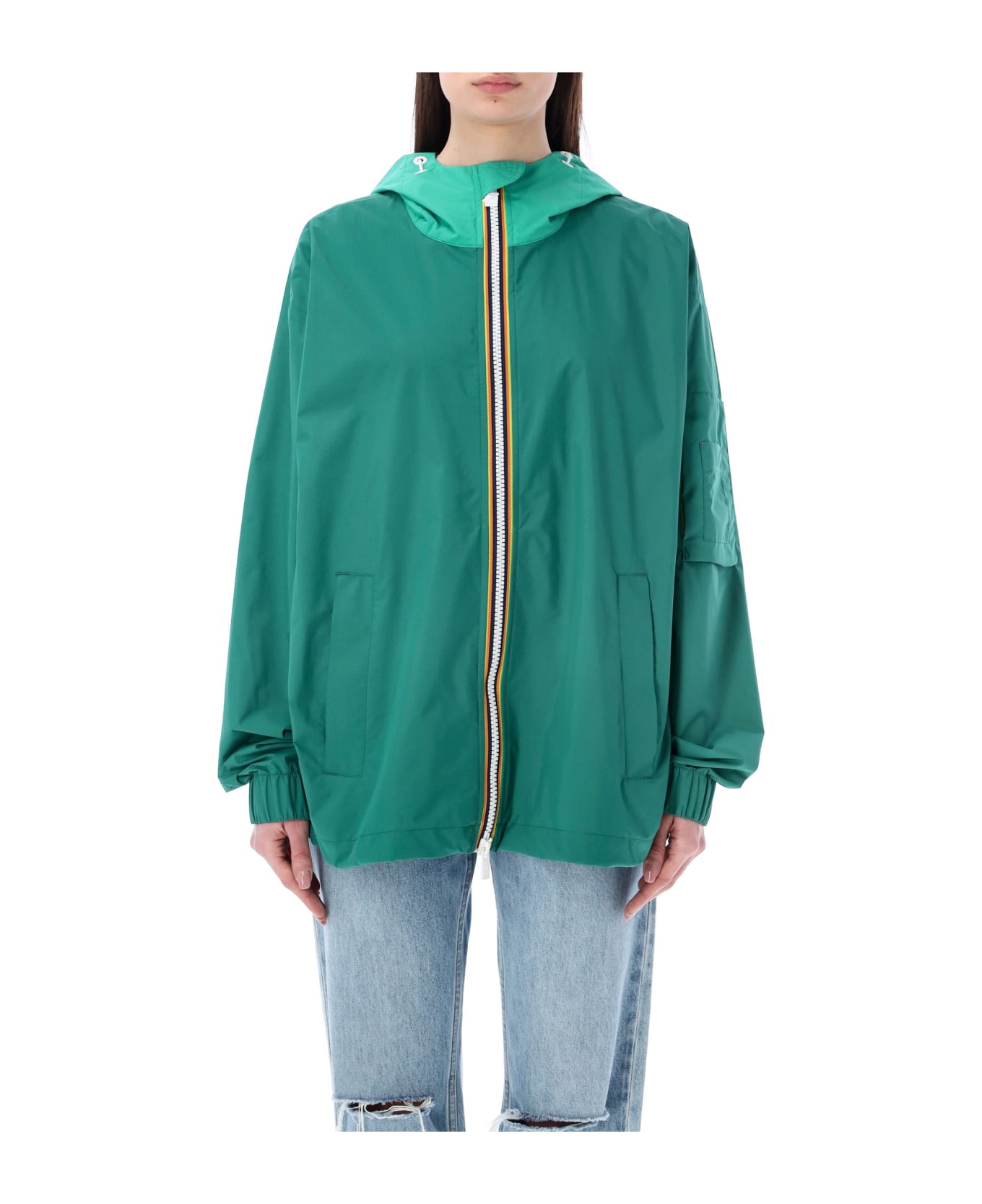 Claudel 2. 1 Amiable Silver Jacket By K-way. Featuring: Adjustable Hood With Elastic Cords Zip Fastening Side Zip Pockets Zip Sleeve Pocket Long Sleeves Elasticated Cuffs Back Ventilation Opening Inner Silver Coating Packable Model Is 1,72 M Tall And She Is Wearing Size M Model Is 1,90 M Tall And He's Wearing Size L