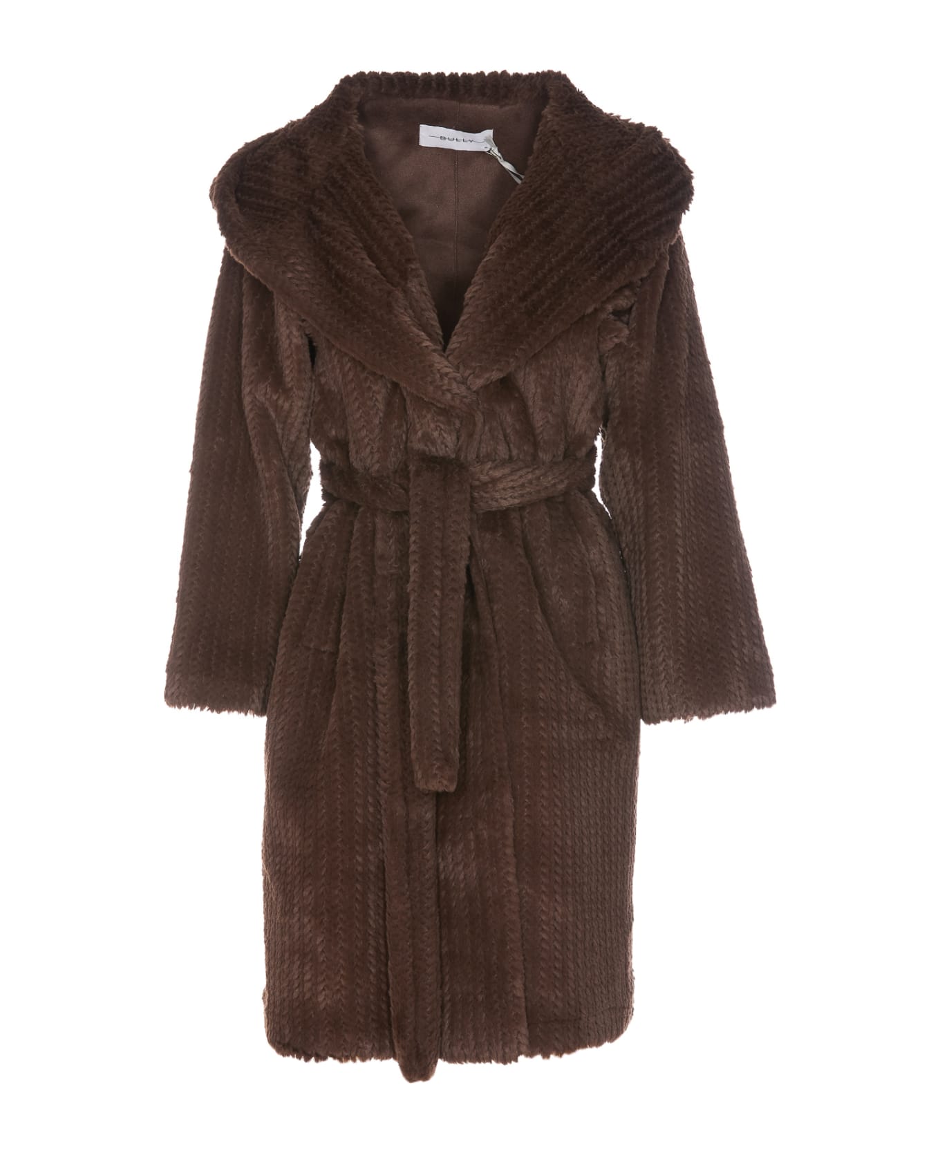 Bully brown coat, hood, double breast buttons closure, belt closure, pockets, midi model