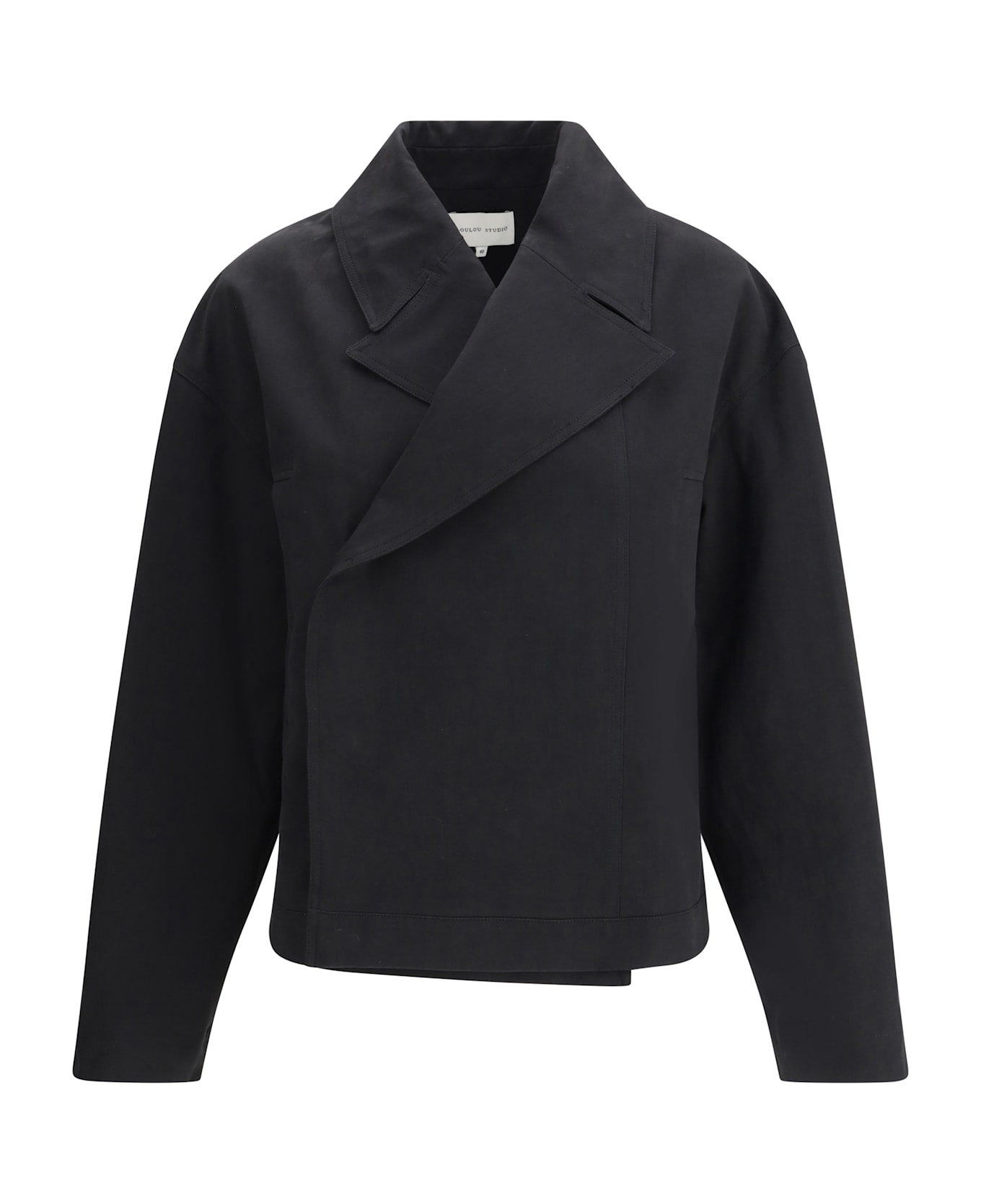 Loulou studio's coen short jacket is a sleek and sophisticated piece, featuring a wide lapel that adds a touch of class to the design. the front, side closure with concealed buttons gives a clean, modern look. the two side welt pockets with flaps offer a functional element without compromising style.
