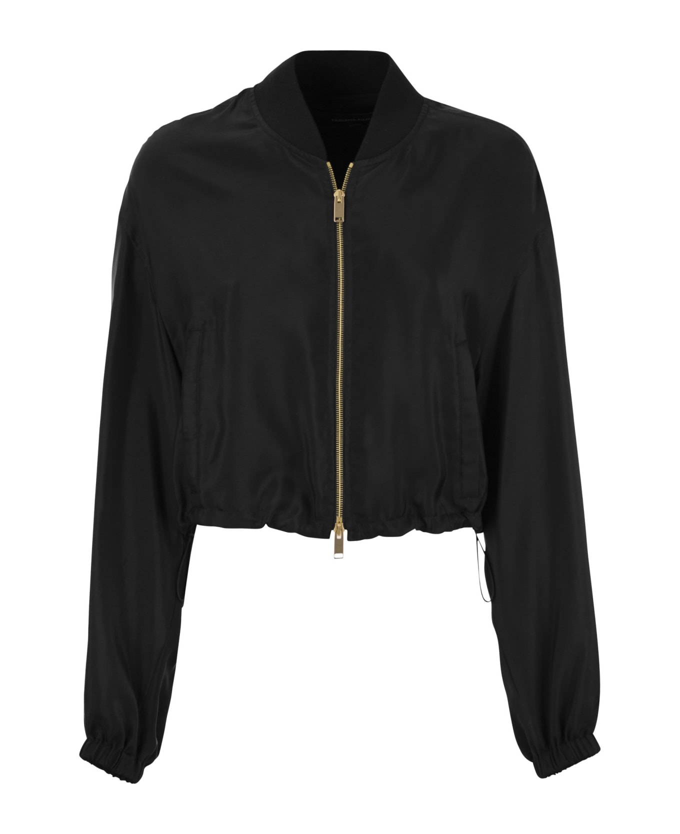 The cropped line defines the dynamic style of this bomber jacket made of cupro. With a comfortable over fit, it is defined by the knitted collar and drawstring at the hem. - Cupro twill - Knitted collar - Drawstring at hem DESIGNER ID: GCD264F199 I906 825