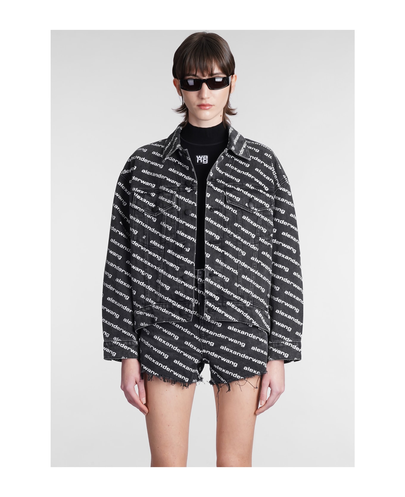 Denim in grey denim, collar, pockets on side, long sleeves, all over logo print, flap pockets, 100% cotton, Made in China, model is 180 cm and wears size 27