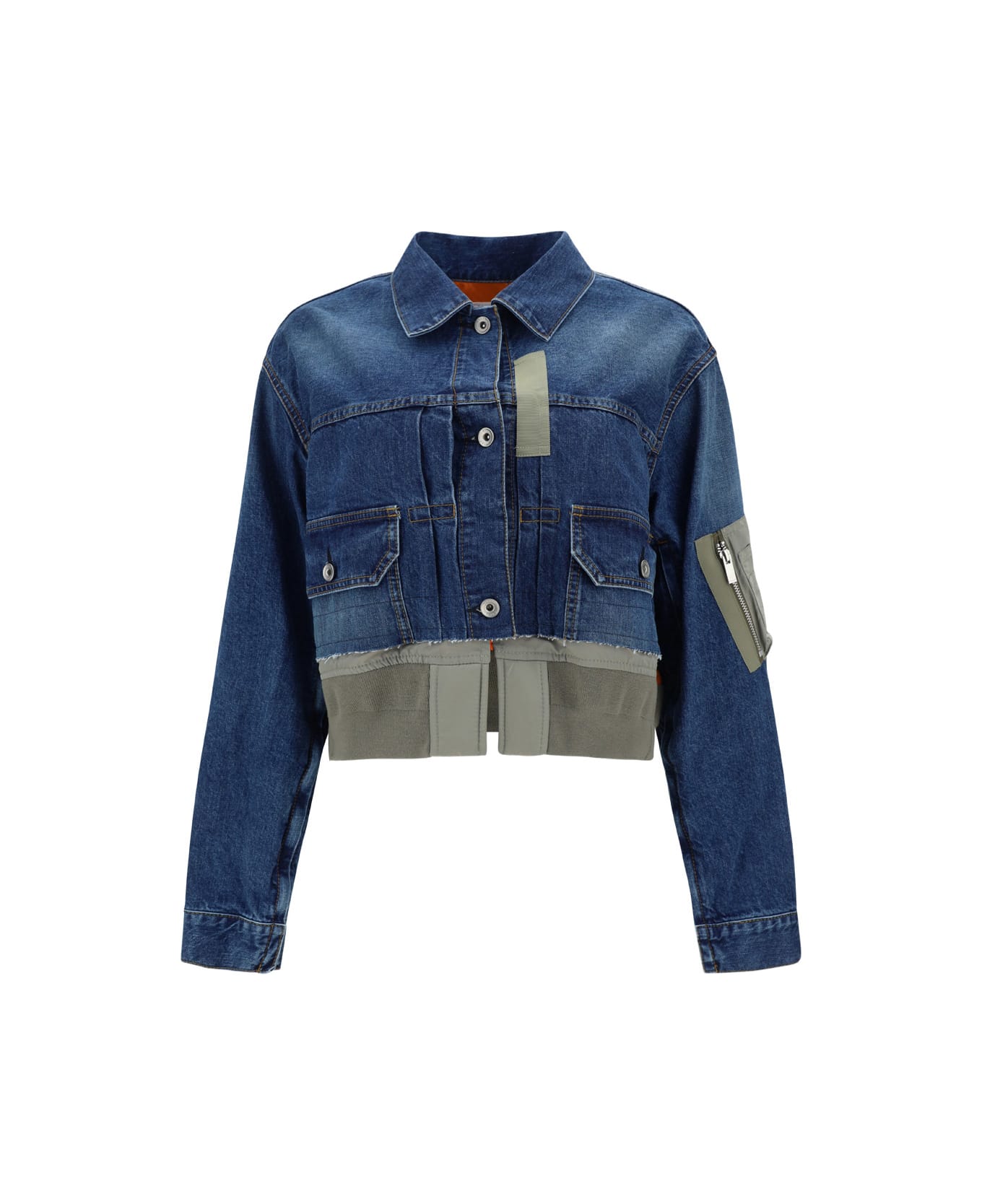 Cotton jacket by sacai, denim design, contrasting front button closure, classic collar, embroidered second layer under the jacket hem with shirt effect, two patch pockets on the front with flap for closure, one contrasting patch pocket on the left arm with zipper for closure, cropped pattern.