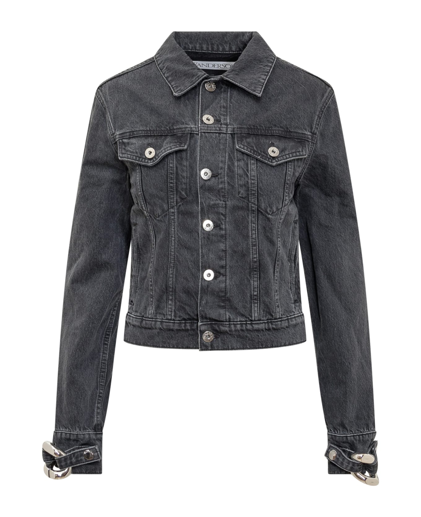 Black denim jacket. Front buttons closure. Chest pockets. Wrist details. Logo on the back.