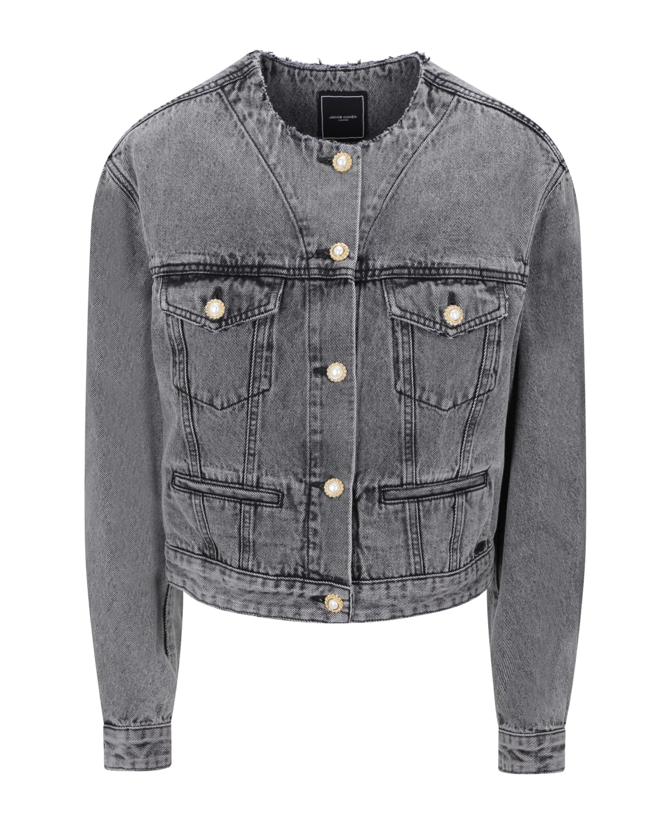 Denim jacket by jacob cohen, frayed crew neck, front fastening by means of jewelled buttons, two patch pockets on the front, washed denim design, two slit pockets on the front, adjustable cuffs by means of a button, oversize fit. Composition: 35% % Cotton, 65% % Polyamide