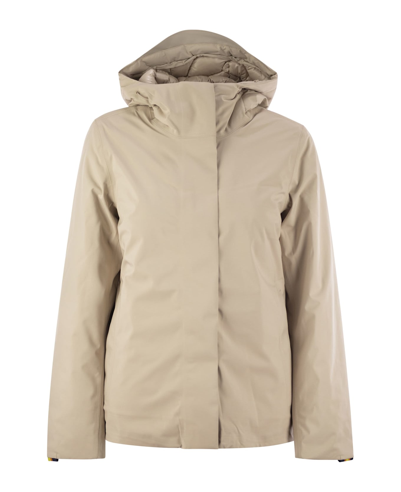 Dorel is a mid-length women's jacket, ideal for winter, that interprets everyday looks with an urban style and clean lines thanks to the absence of logos on the front. This cosy fit jacket with zip fastening and adjustable wrap-around hood features a three-layer technical fabric shell with outer nylon, mid-membrane and jersey with contrast-coloured heat-taped inner seams. The warm floating wadding and comfortable quilting on the inside guarantee optimal protection from the coldest weather. The model has welt pockets and K-Way tape detail on the cuff. - Three-layer stretch, water-repellent, windproof fabric - Floating wadding - High degree of warmth - Zip closure - Pockets with concealed buttons - Adjustable hood - Taped seams - Regular fit - Logo inserted in sleeve bottom DESIGNER ID: K5136EW AR8