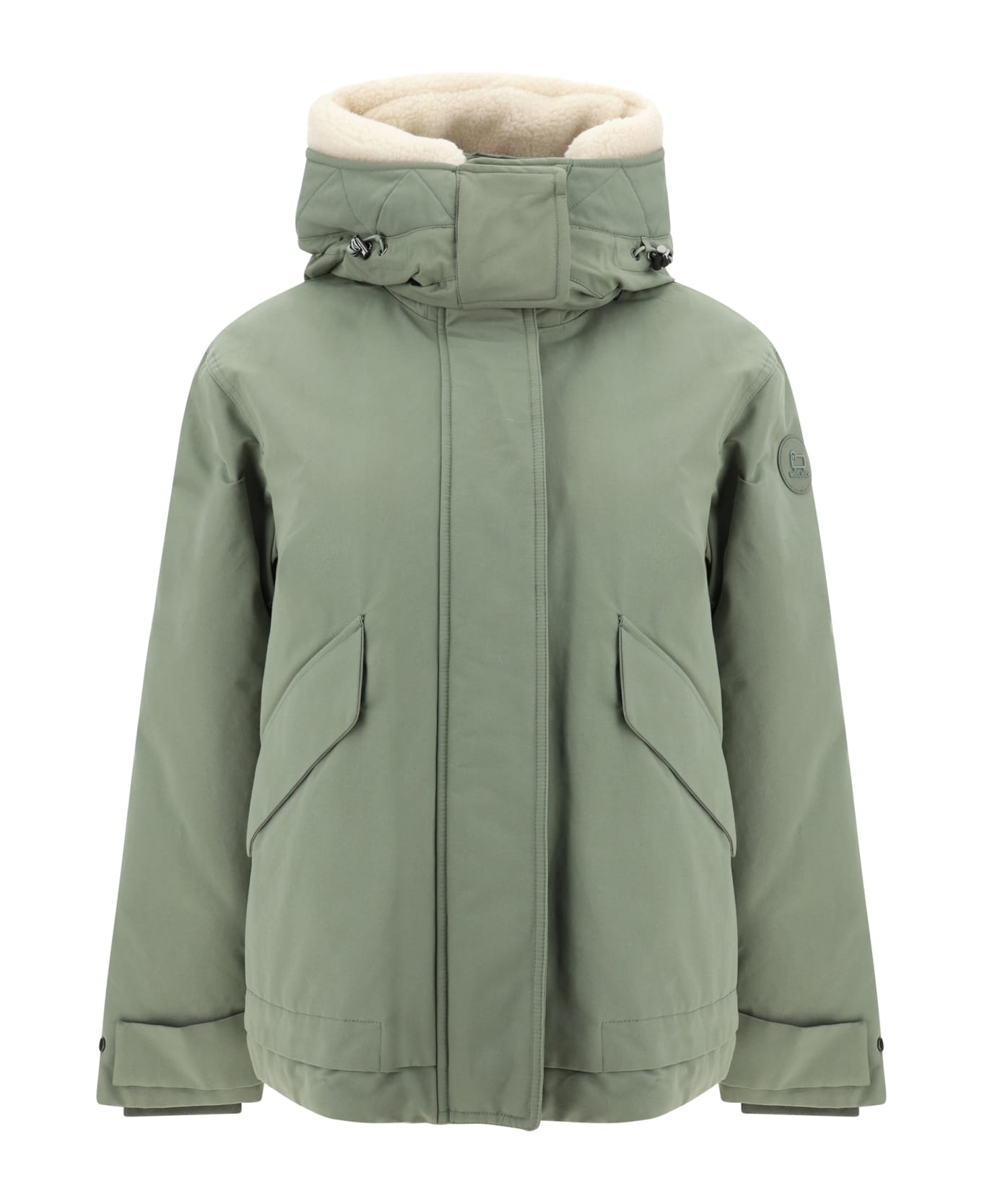 Cotton down jacket by woolrich, high-neck design with adjustable and removable hood by drawstring, padded monochrome design, front closure by buttons and concealed zipper, two flap patch pockets on front, elastic ribbed cuffs adjustable by button, patch with iconic brand monogram applied on sleeve, bouclé effect collar, adjustable hem by drawstring, regular fit.