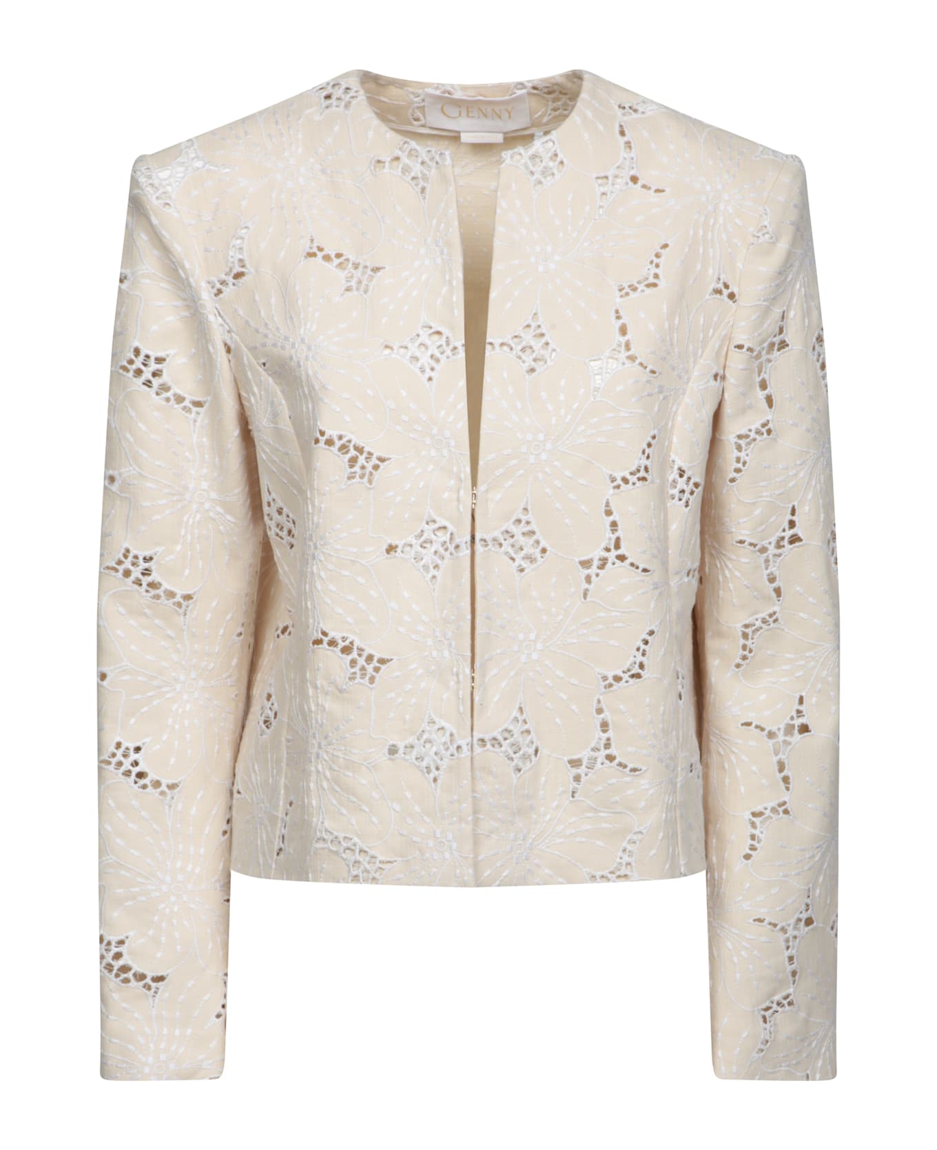 This elegant GENNY jacket features a refined jacquard fabric with an intricate beige floral design that adds a touch of class to any outfit. The lack of front buttons highlights a clean and modern silhouette.