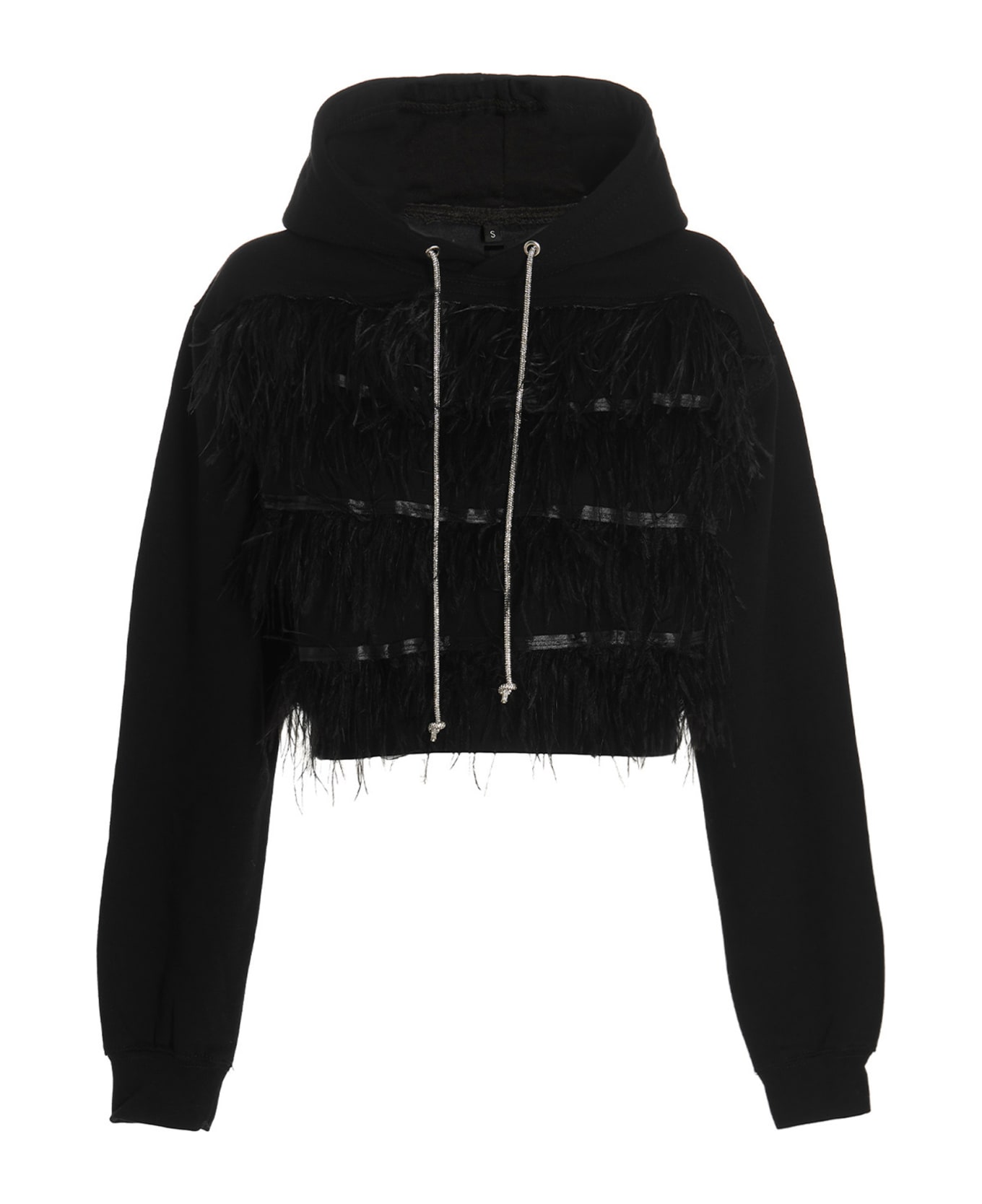 Cropped hoodie with a feather appliqué on the front, long cuffed sleeves, jeweled drawstring detail.