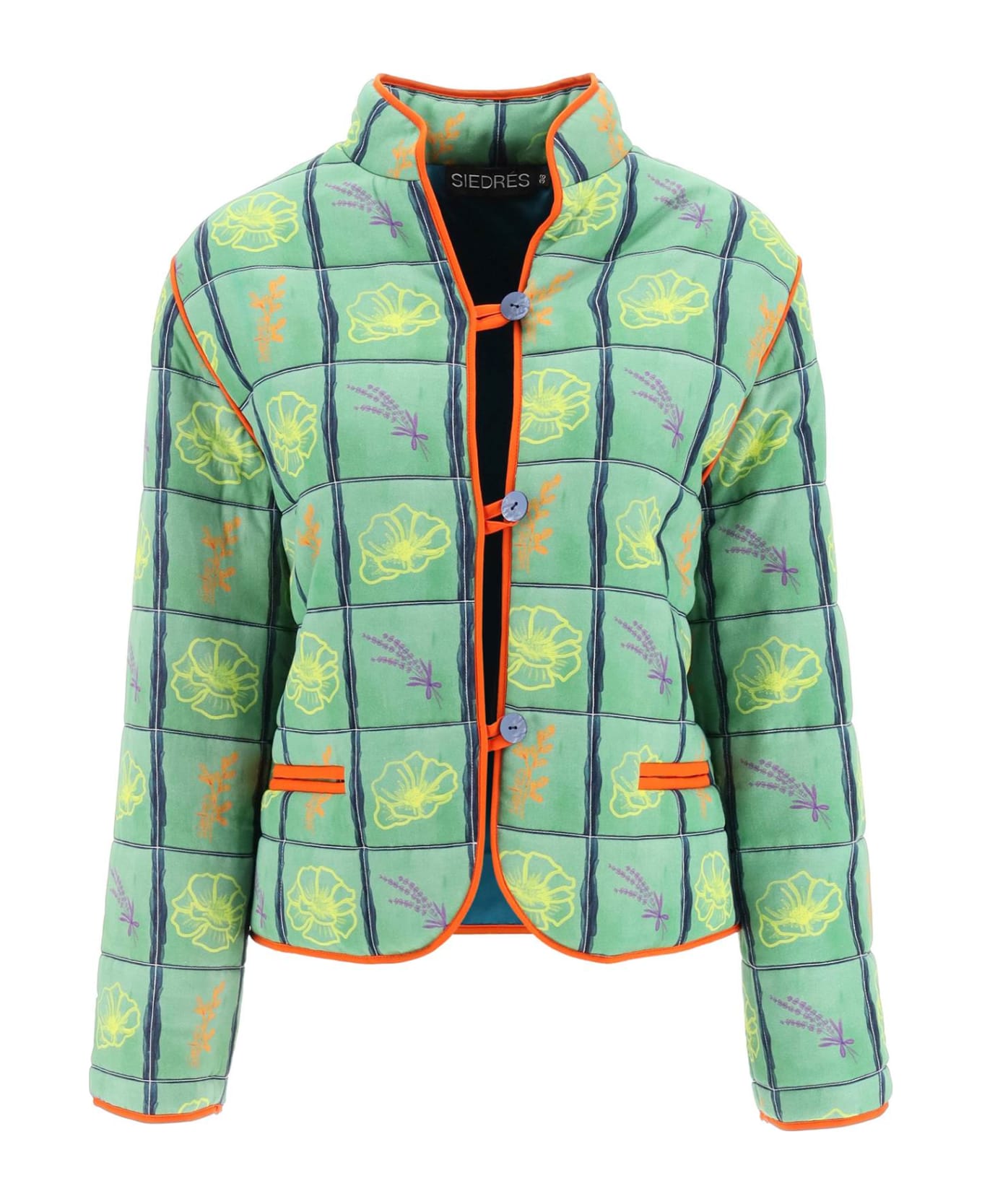 Siedrés jacket made of lightly padded, quilted viscose, with an all-over floral print. The oversized boxy silhouette is finished with a Mandarin collar, a front closure with mother-of-pearl buttons, and contrast trims. The model is 177 cm tall and wears a size EU 36.