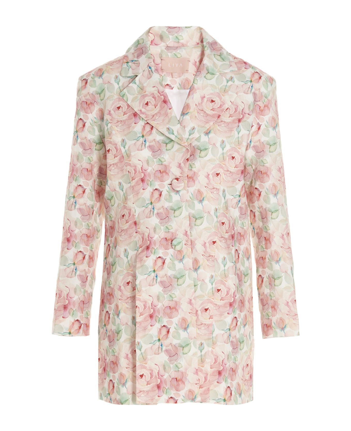 'Flowliya' single breast blazer jacket in linen featuring an all over floral print, a front button closure, padded shoulders, and splits at the front and back.