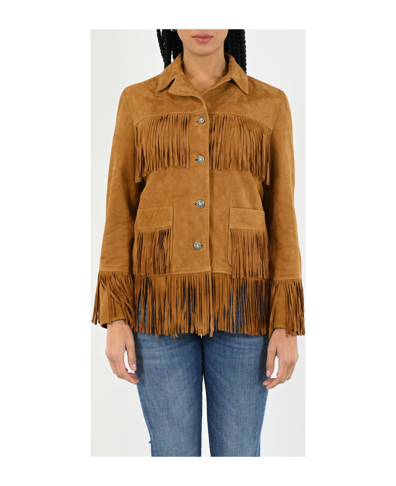 solid color suede fringes jacket. reverse neck. californian-style button closure. flat pockets on the front. matching fringes applied on the front and back. roy roger's logo printed on the back. contrast fabric lining. regular fit. composition: 100% suede.