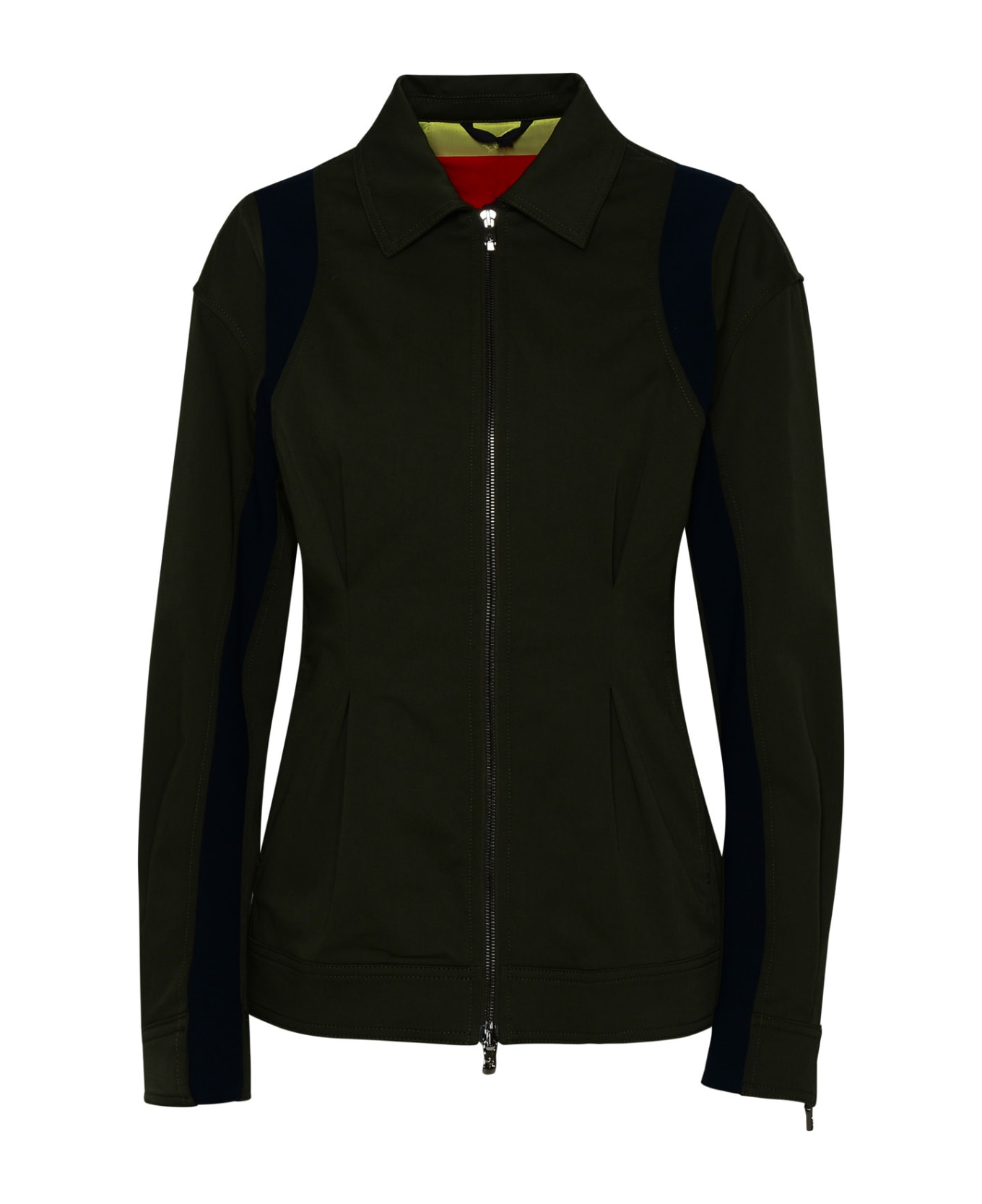Hourglass cut, front pincing, shirt collar, zipper closure, contrasting stretch nylon blend inserts, back Rampant Calf hair patch
