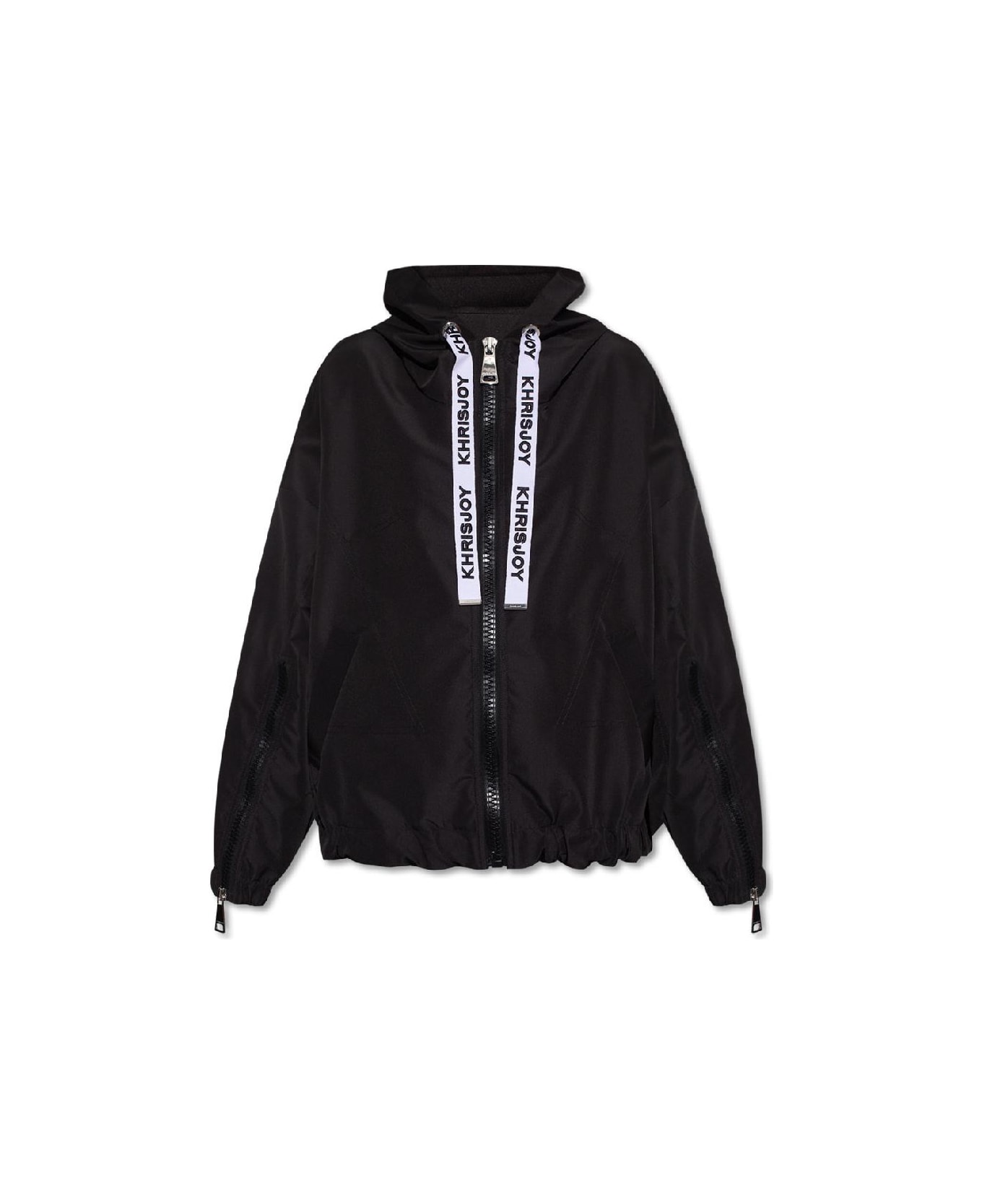 Black jacket from Khrisjoy. Spun from synthetic yarns, this style features a drawcord-adjustable hood and hem with embroidered branding, a zip fastening, two slip pockets and elasticated cuffs.