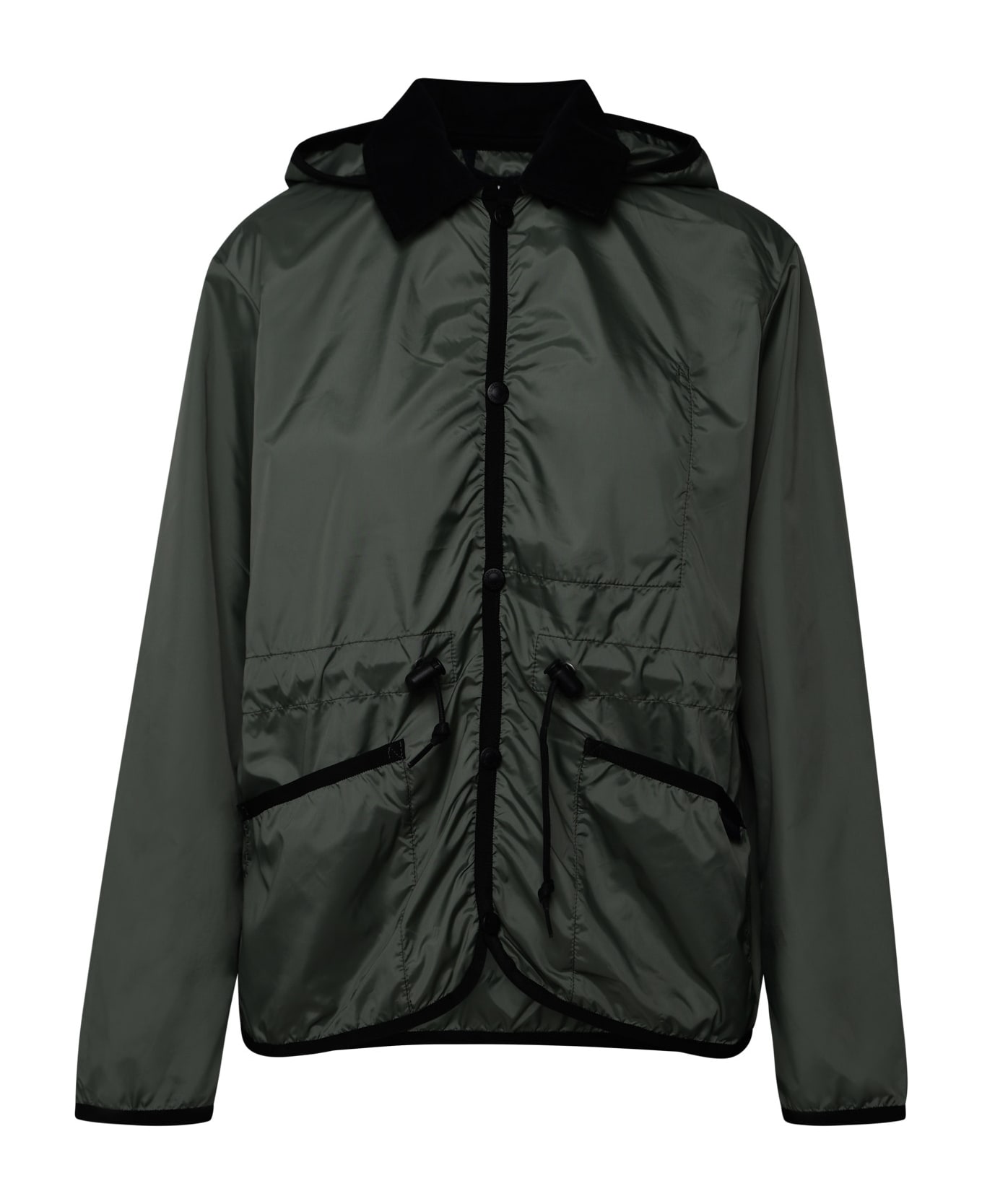 Corduroy pointed collar, adjustable drawstring at the waist, front pockets with logo label, polyester trims, front button closure