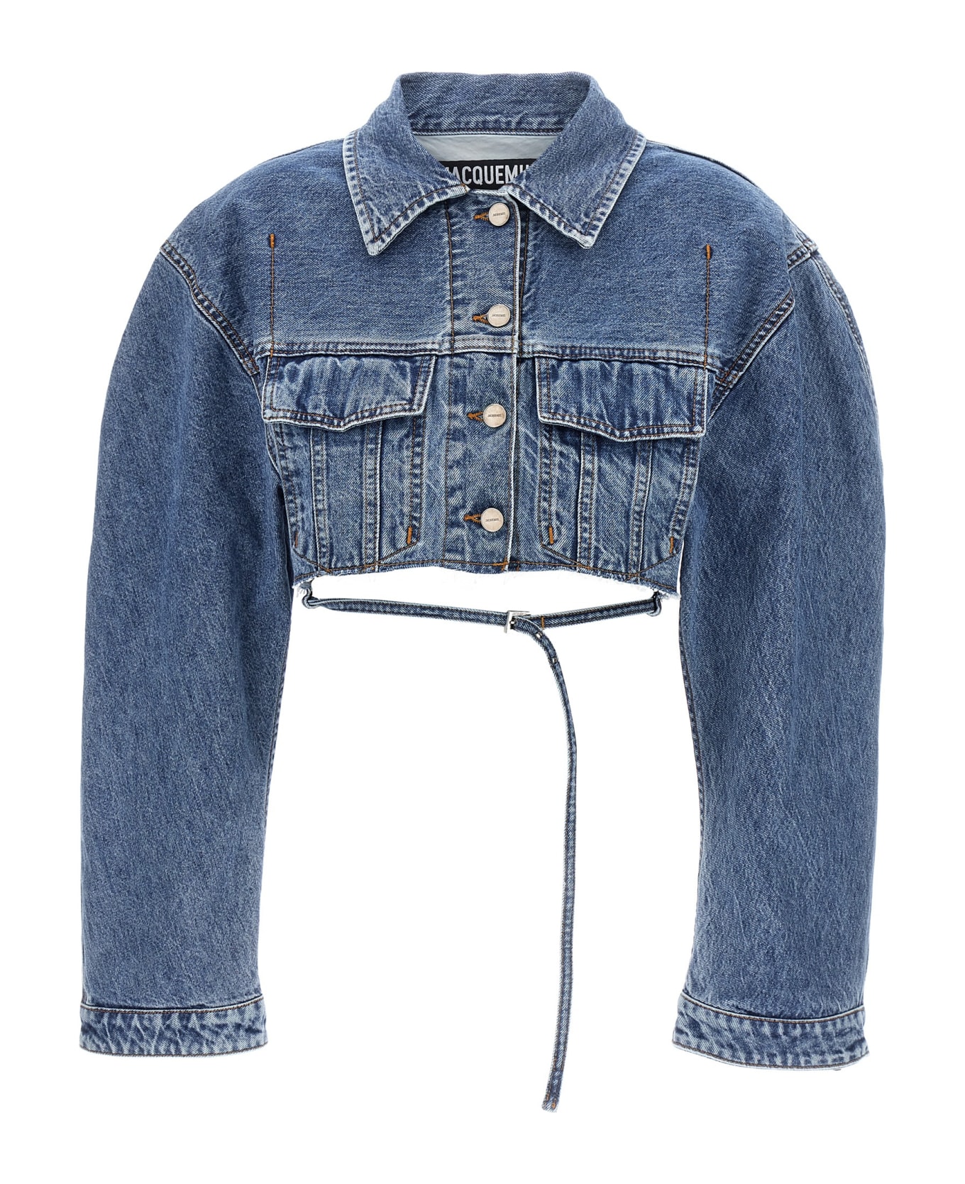 'Le haut de nimes corto' cropped denim jacket with raw cut hem, button closure, double chest pocket, oversized sleeves and a strap at the waist. Composition: 100% organic cotton
