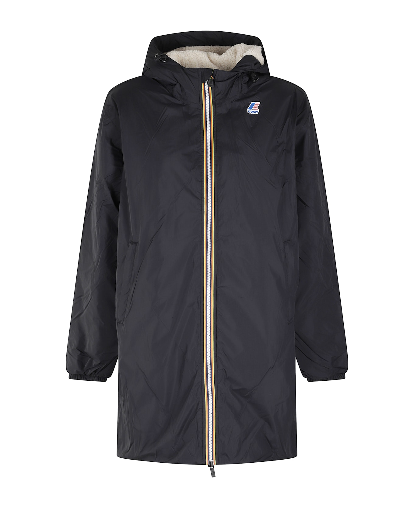 Le Vrai 4. 0 jacket - K-WAY - Black color - Adjustable hood with elastic cord - Sherpa fabric lining - Front zipper closure - Elastic cuffs - Flush side zippered pockets - Maxi length - Colorful printed logo.
