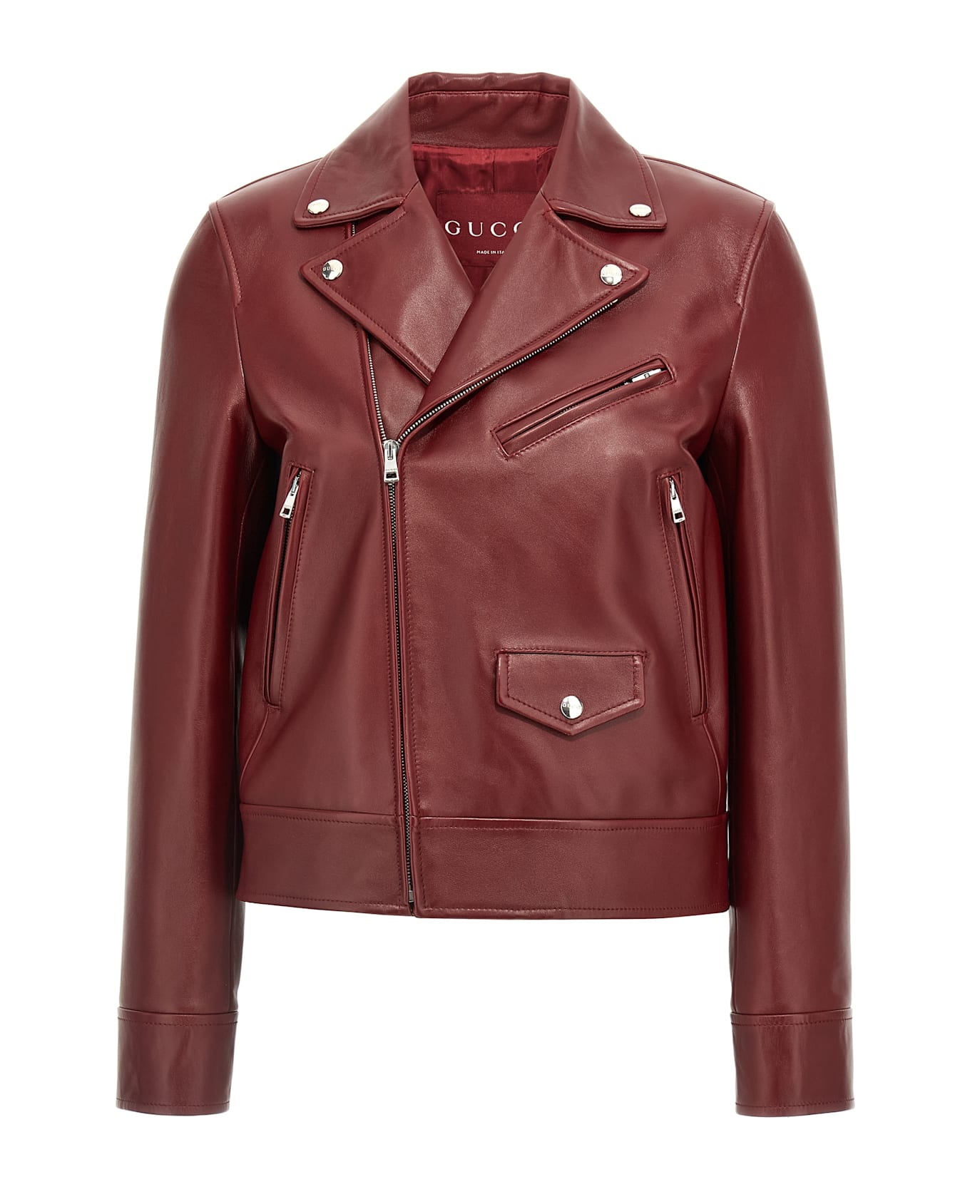 Leather biker jacket, peak lapels, snap button pockets, asymmetric zip closure, long sleeves with zip on the cuff, and embossed logo on the back. Composition: 100% lamb leather (Ovis aries)