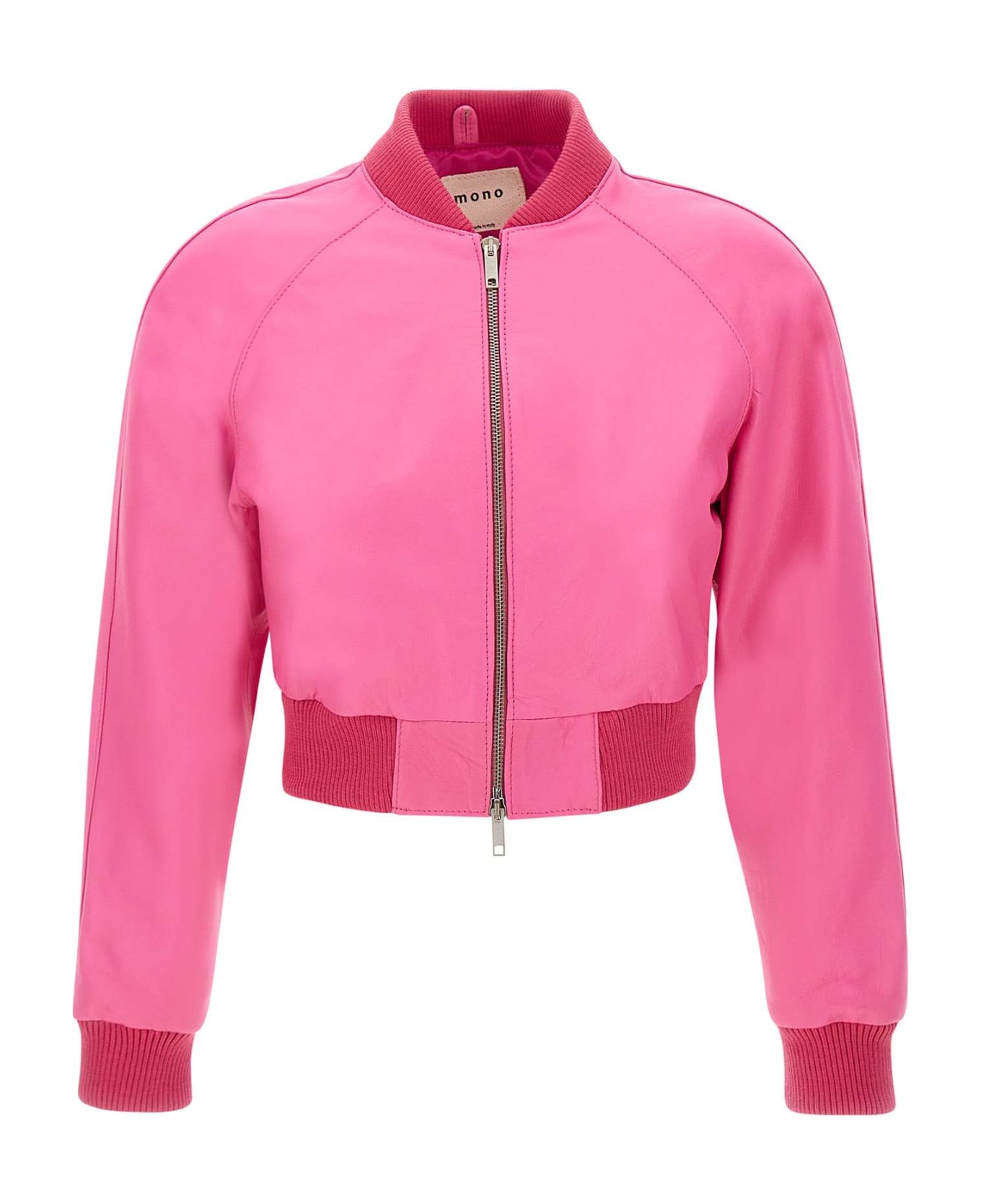 Mono women's bomber jacket vegetable leather, bright fuchsia, cropped design, collar and part of hem in ribbed knit, front fastening with double-slider silver zip, matching lining, ideal for a gritty and romantic look in high and low season. Made in Italy.
