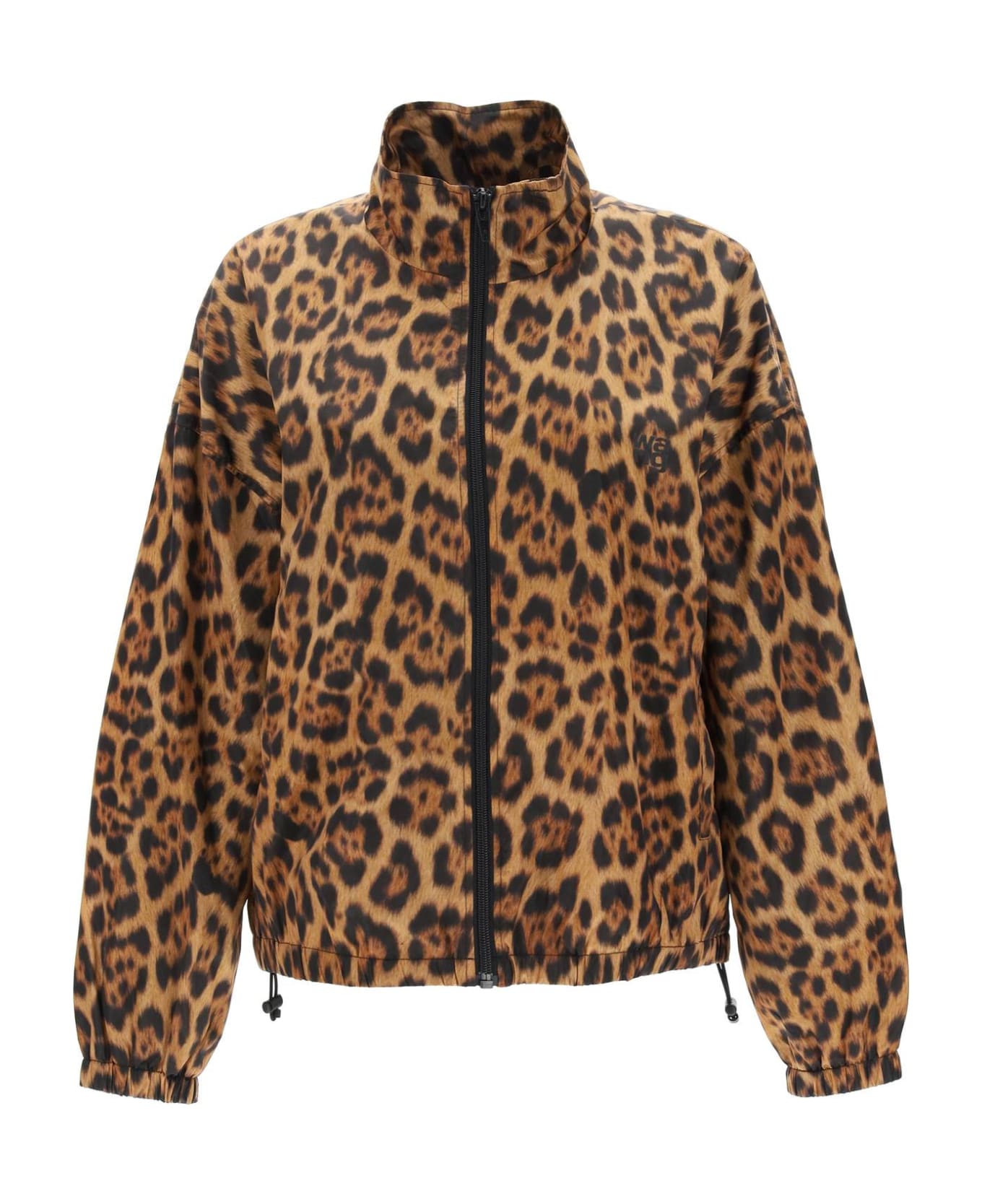 Alexander Wang blouson jacket made from nylon canvas with leopard print all-over. It features stand collar, front zipper fastening, side welt pockets with concealed zipper, elasticated cuffs and adjustable hem with elastic drawstring. Enriched by rubberized logo on the chest and lined in mesh on the inside. Loose fit with low-set sleeves. The model is 177 cm tall and wears size S.
