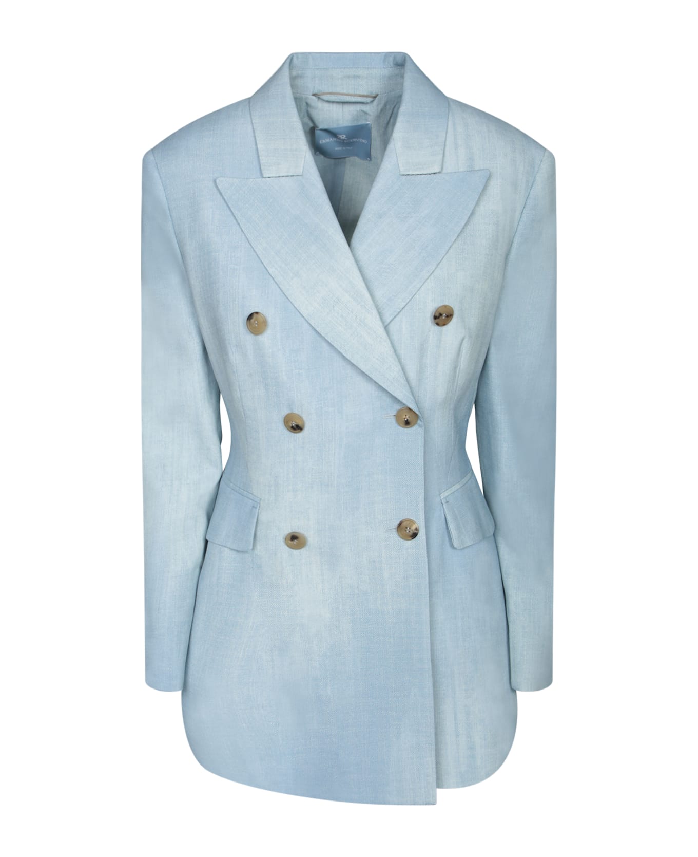 This Ermano Scervino jacket, with its exclusive denim-effect viscose finish, blends elegance and versatility. Featuring a double-breasted cut and contrasting buttons, it's perfect for a sophisticated look that stands out.