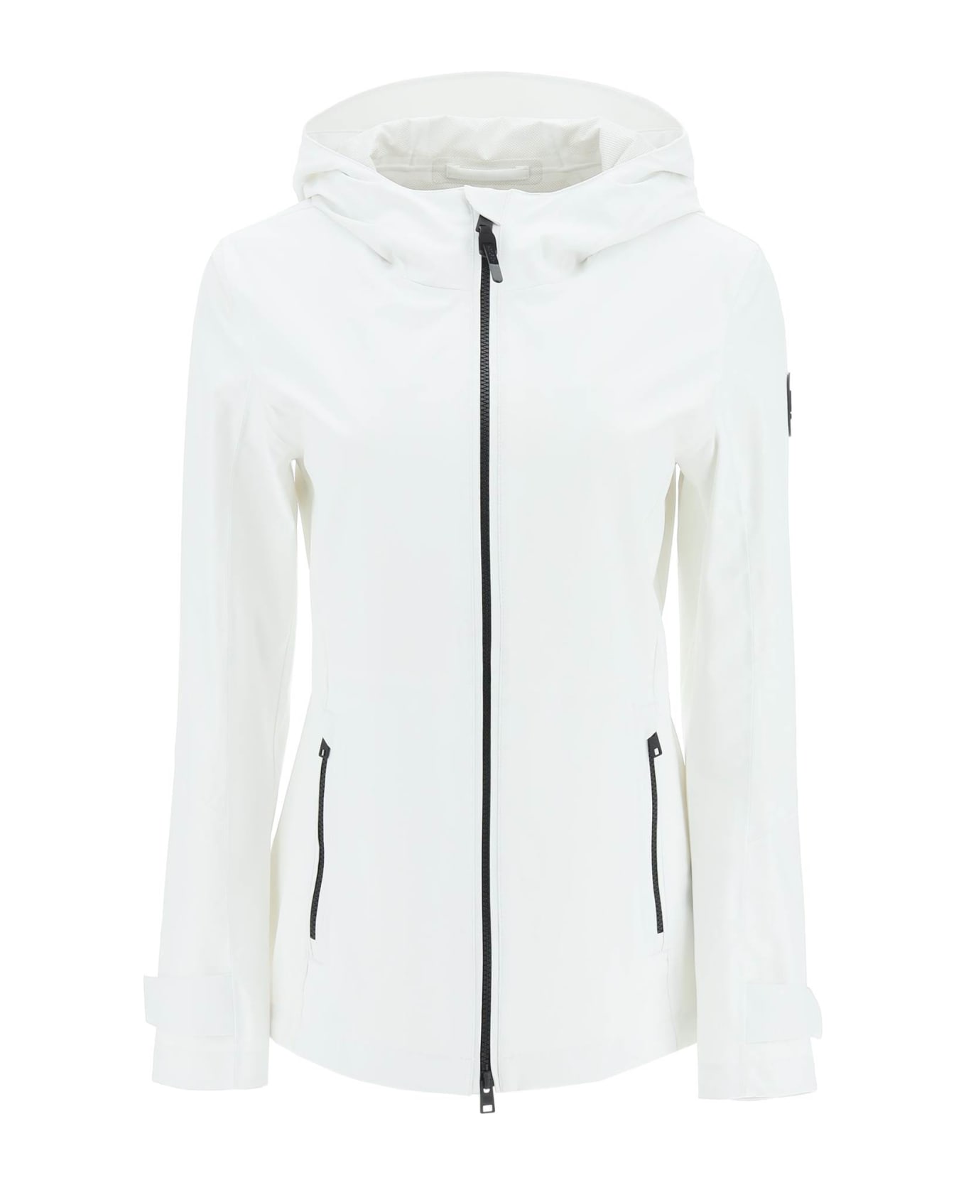 Lightweight softshell jacket by Woolrich featuring a slim line with adjustable hood, double-slider zip closure, zip pockets, and adjustable snap tabs on the cuffs. Silicone logo patch on the sleeve, unlined interior. The model is 177 cm tall and wears a size S.