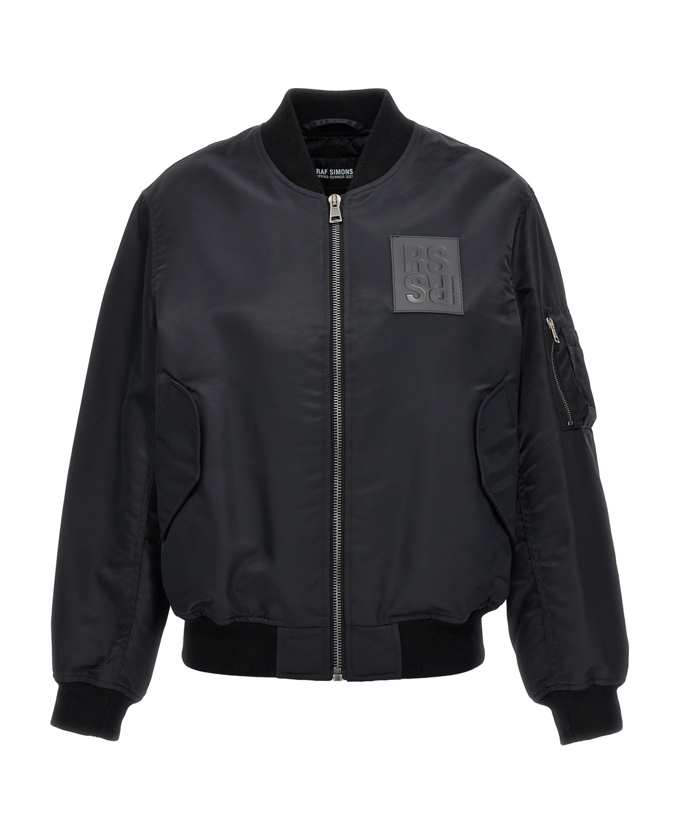 Nylon bomber jacket with front leather logo patch, zip closure, knitted cuffs, collar and hem.