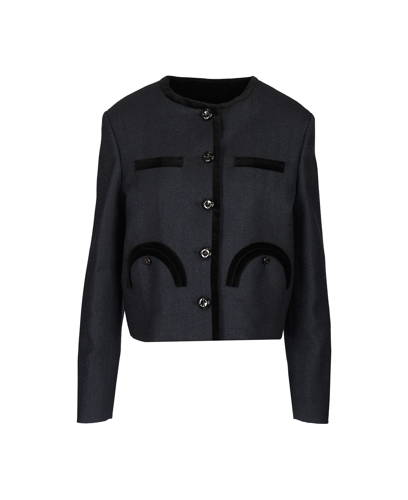 "Maine" virgin wool bolero jacket by Blazè, with velvet profiles, front button fastening and Smiley pockets